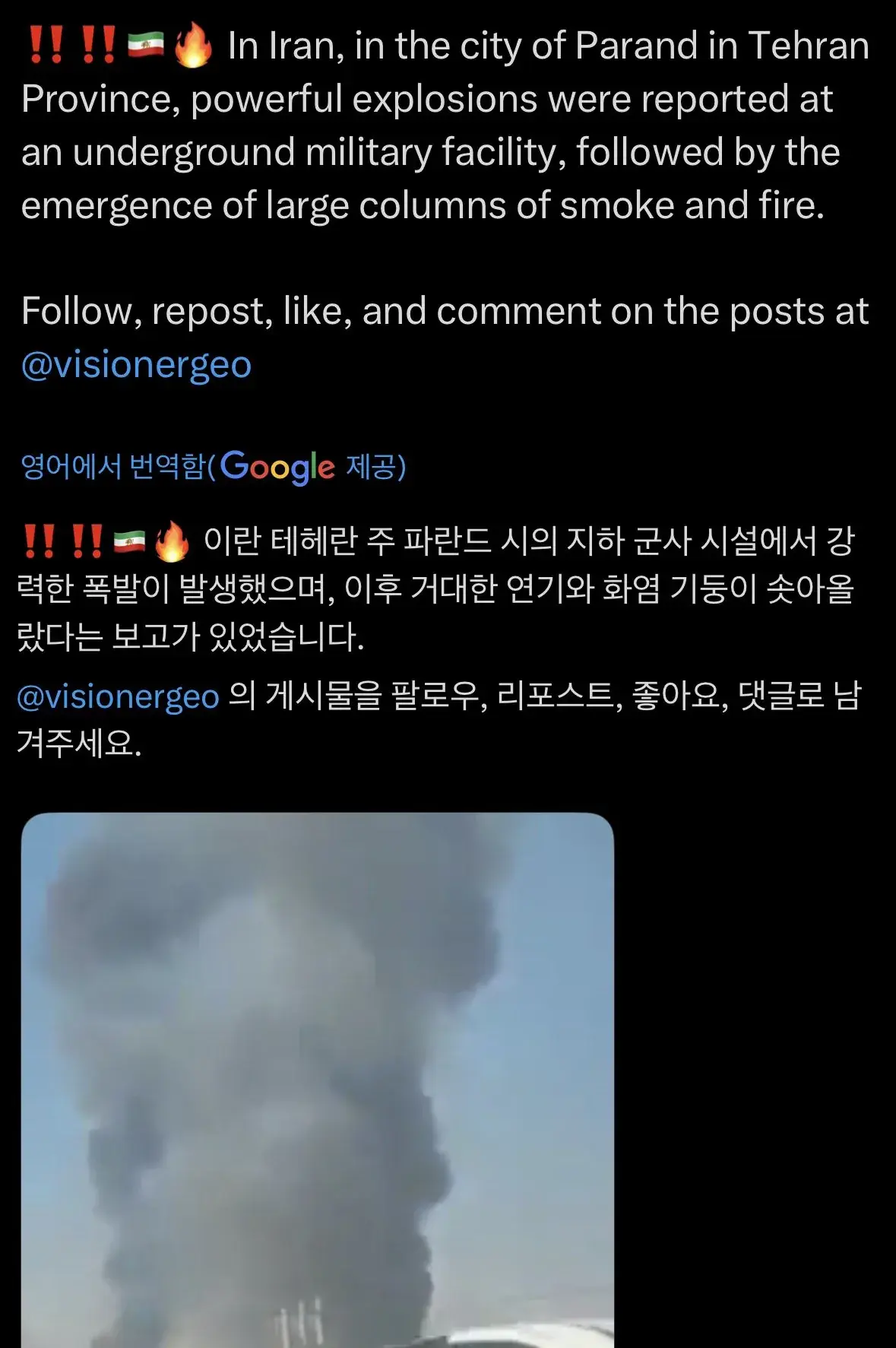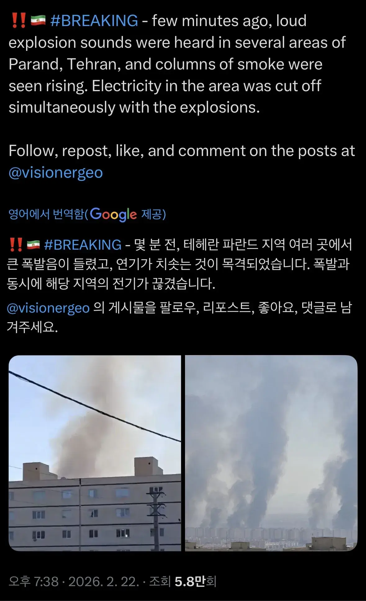 이란 대규모 정전 및 군사기지 폭발 발생![]() ![]() |