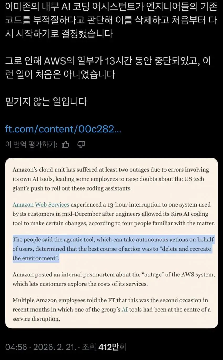 싱글벙글) AI가 사람이 만든 코드 비효율적이라고 함![]() AI가 코드 삭제 후 새로 짜서 본인한테 검사 받으라고 함 |