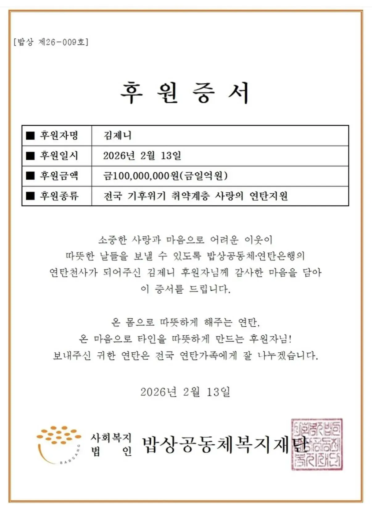 블랙핑크 제니 1억 기부![]() 연탄 1억 기부 |