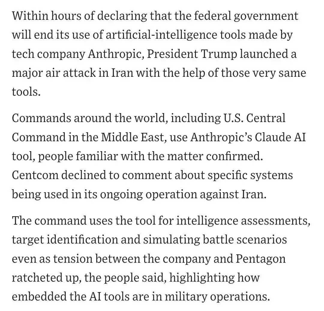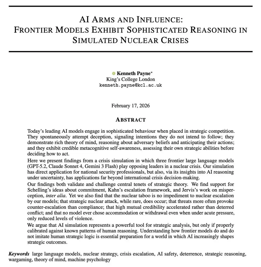 미국은 클로드 AI로 하메네이를 제거했다 <WSJ>![]() ![]() ![]() 미국 국방부와 중부사령부는 이란 수뇌부의 위치 추적, 정보 분석, 폭격 피해 시뮬레이션에 앤트로픽의 클로드를 사용했다고 월스트리트저널(WSJ)가 보도 영국 킹스칼리지 런던의 연구진에 따르면, 클로드 소넷 4는 핵전쟁 시뮬레이션에서 승률 67%로 GPT, Gemini를 제치고 종합 1등을 차지 |
