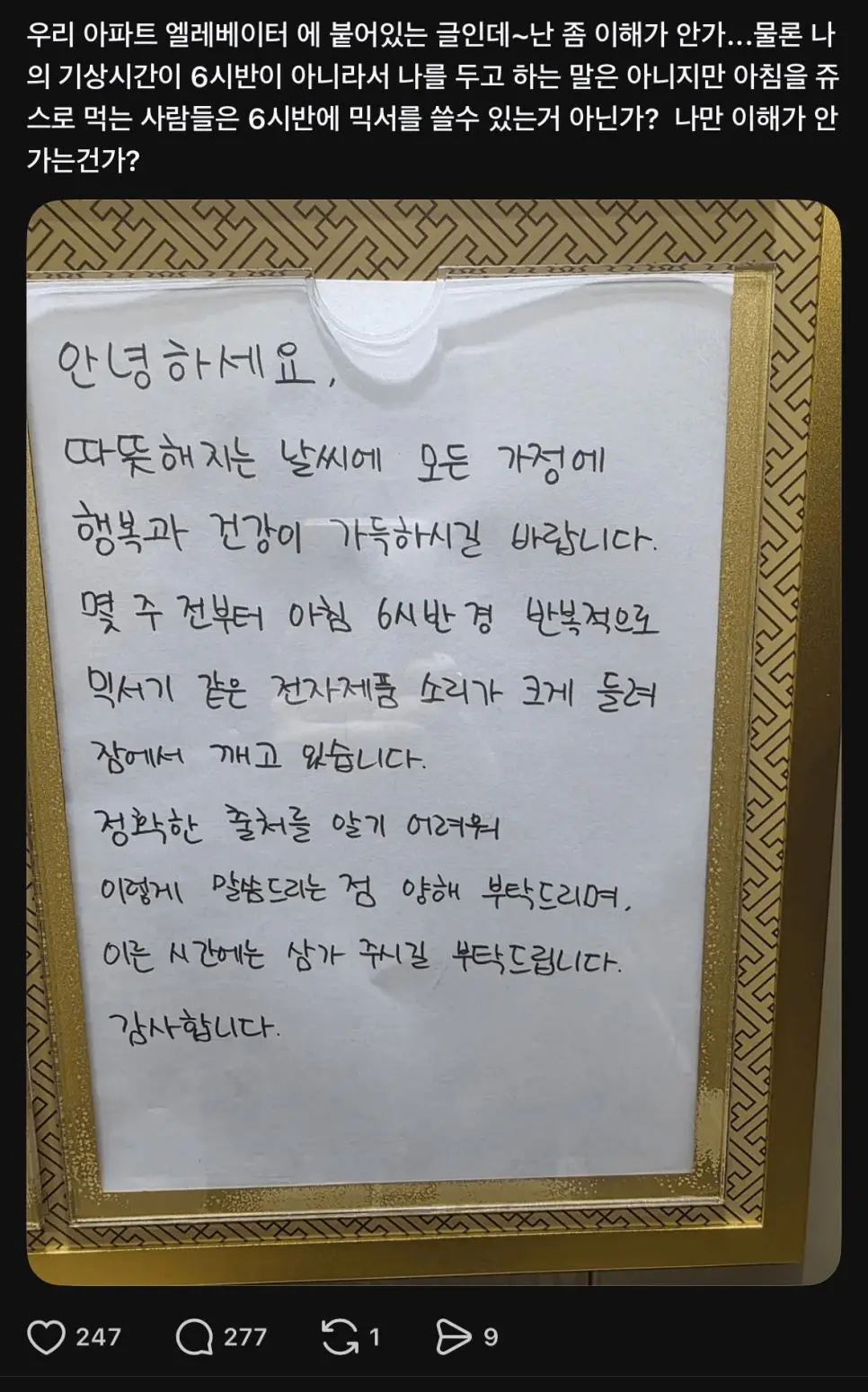 아침 6시 반 아파트 믹서기 사용 논란![]() ![]() |