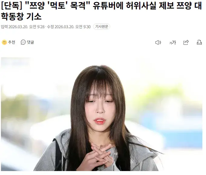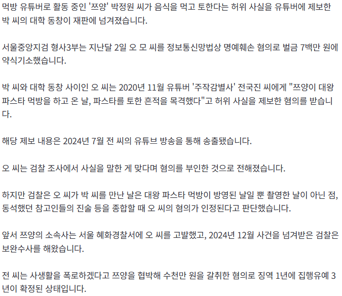 [단독] "쯔양 '먹토' 목격" 유튜버에 허위사실 제보 쯔양 대학동창 기소 |