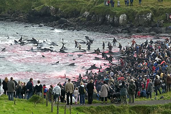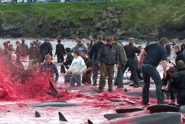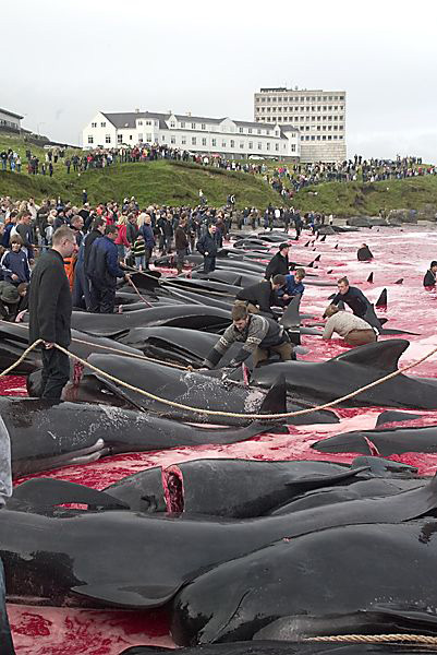 [이곳에선 고래잡이 행사가 벌어지고 있다. 이곳 어부들이 그물로 고래를 해안으로 몰고, 작살이나 갈고리로 직접 숨통을 끊는다. 관광객들이 몰려 사진을 찍고 있고, 원한다면 직접 참여도 가능하다고 한다.]