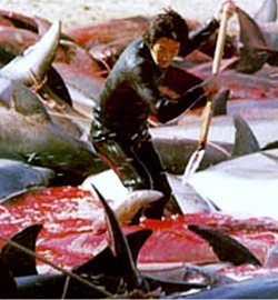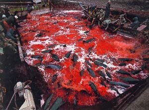 (이하 혐오장면 일 수 있으므로 노약자나 비위 약하신 분들은 자제를...) . . . . . . . . . . . . . . . . . [일본의 돌고래 사냥. 그물로 돌고래들을 몰고 있다. 겁에 질린 돌고래들이 몸부림쳐 바위 등에 상처를 입는 바람에 이미 바다는 피에 물들었다.]