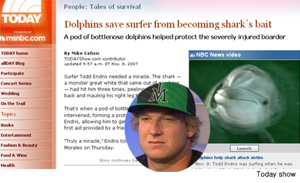 미국의 한 서퍼는 서핑 도중 4미터 짜리 백상어의 공격을 받았다. 허리와 다리를 한차례씩 물린 이 남자는 거의 죽을 위기에 처해 있었다. 그때 돌고래 한마리가 나타나 백상어의 공격을 방해하기 시작했다고 한다. 돌고래가 번번히 상어의 공격을 방해하는 틈을타서 남자는 무사히 구조될 수 있었다.