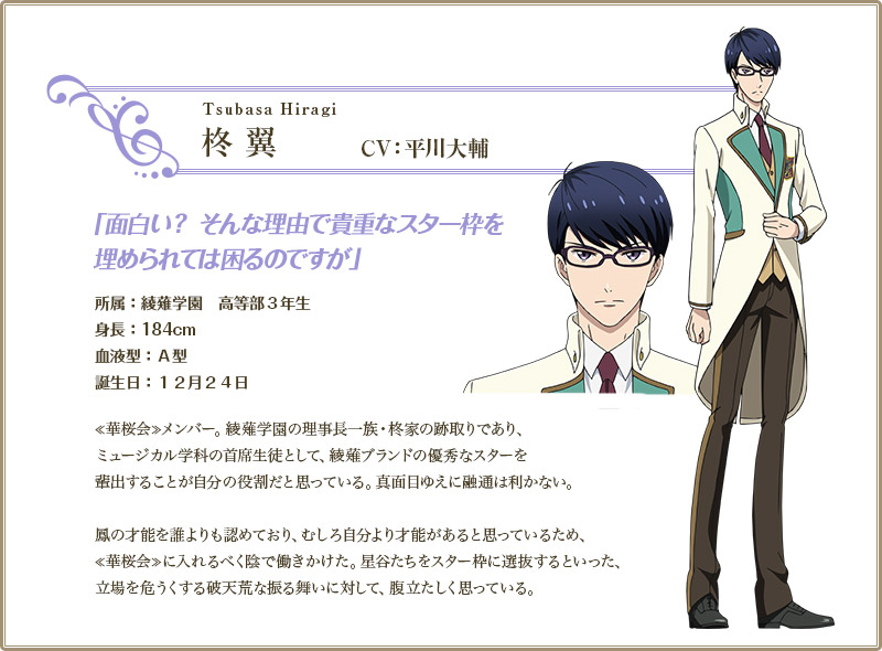 (캐릭터가 생일) 제목 : 스타뮤 이름 : 히이라기 츠바사 성우 : 히라카와 다이스케 / 요시노 유나 (어린 시절) 이미지 컬러 = 백등색