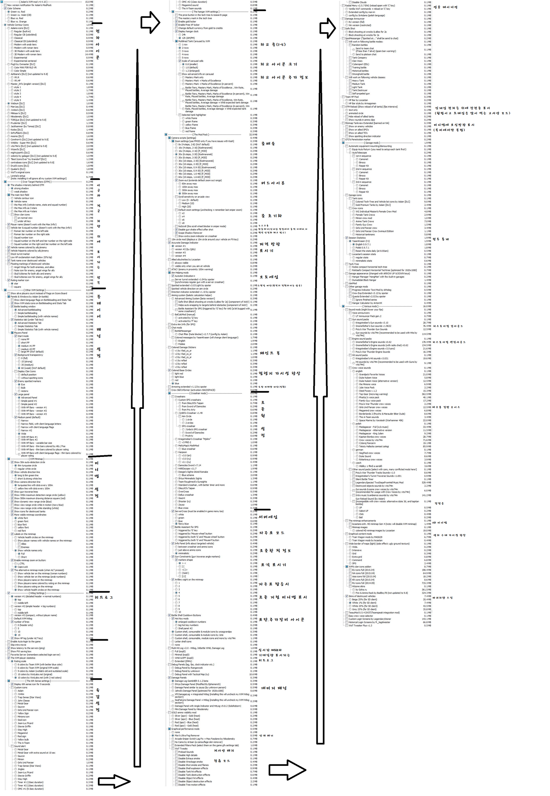 Aslain's XVM Installer 4.4.10을 이용해 제작(모든 설정은 Aslain's XVM Installer에 그대로 있음) 게시된 짜장 배달 모드팩에 추가적으로 다른 모드를 넣어서 쓰고 싶은 분들은 Aslain's XVM Installer를 직접 활용해서 만드시는게 훨씬 빠릅니다.