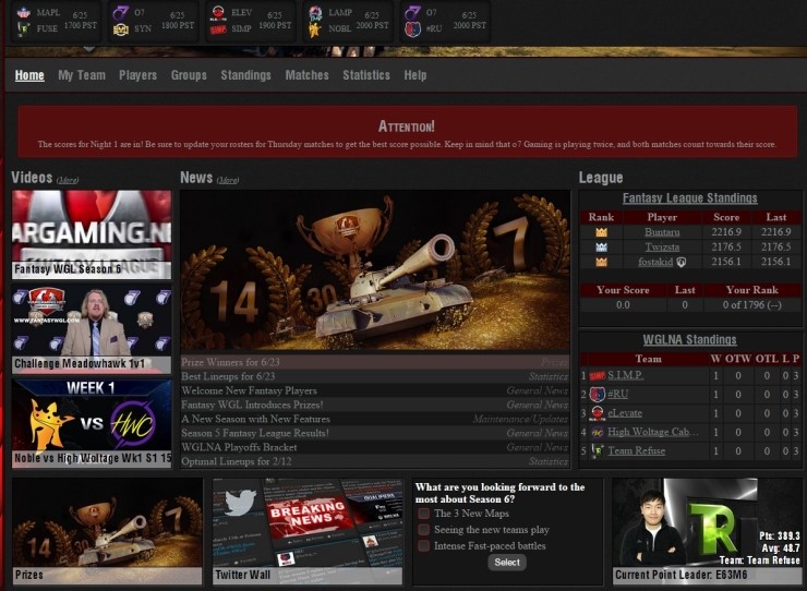 심지어 시즌이 끝나고 상위권에겐 파이널이 열리는 장소까지 여행할 수 있는(호텔, 항공권, 식사 제공) 패키지 + 호구식등을 제공 합니다... 이긴 하지만 아마 북미 거주자에 한해서 인것 같습니다. 플레이 방법은 간단합니다. http://www.fantasywgl.com/ 에 들어가 월탱 계정으로 로그인하고 Players or Teams 을 선택해 ADD Player or Drop Player를 누르시면 됩니다. My Team 에서는 선택한 플레이어에 대한 정보를 확인 하고 관리 할 수 있습니다. 7명의 자신만의 슈퍼 팀을 만들어야 하고 그 플레이어들이 점수가 높기만 바라면 됩니다. 위에서 말했듯이 팀당 2명씩만 고를 수 있습니다. (무슨 도박 같기도 하네요 토토같기도 하고) (자 열심히 설명했으니까 자랑해야지..) 시즌3 ,시즌4, 시즌5 를 16개 팀중 상위권(이라 쓰고 우승권 실패 라고 읽는다 4, 5, 6위..) 로 끝냈습니다 팀이름은 Top Tier 였고요 이번시즌은 조금 칼을 갈아서 Team Refuse 라는 약간은 조금 생소한 유럽계 게이밍 커뮤니티에게 스폰을 받게 되면서 팀 이름을 바꾸어 Team Refuse로 4번째 시즌을 참가하게 되었습니다. 매 시즌 상위권으로 끝내긴 했지만 우여 곡절도 많고 팀 멤버도 들락 날락하면서 어수선 했었는데 이번 시즌은 마음을 가다듬고 다들 열심히 해주고 있지요. 어제 첫경기 였는데 생각보단 힘들게 이겼습니다. 아무리 연습을 많이 해도 (그래봤자 일주일에 두시간씩 3번 총 6시간이지만..) 다른 팀들 또한 호락호락 하진 않네요. 뭐 그래도 결과는 좋게 되어서 5:3으로 이기게 되었고 참가한 팀 멤버 대부분의 개인성적또한 119명의 등록된 프로플레이어중 25위권 안쪽을 전부 좋은 퍼포먼스를 보여줬습니다. 뭐 그래서 어쩌다보니 제 얼굴도 정문에 나왔어요. 이런날도 있구나.. ![]() 뭐 무튼 북미 하시는분들 Welcome New Fantasy Players 란 이벤트 참가하시면서 WGLNA 월탱의 또하나의 컨텐츠도 즐겨보시고 저희 팀도 응원해주세요 ^^ (E63M6을 뽑아주세요 사실 뽑혀봤자 아무것도 없지만..) 저희팀은 한국 선수가 많아요 memoryleak, SPGsMaster, DazzlingTime등 역시 게임강국 전투민족. 또 다른 한국분 Swipple 님도 다른팀에서 활동중이시고요 한국인 2세들도 두 세명 있네요(토푸스머프, 셀라 등) 최선을 다해서 골드 혹은 다른 상품을 를 따실 수 있게 열심히 하겠습니다. 그럼 꾸벅! 즐탱하세용 Welcome New Fantasy Players With the start of a new WLGNA season and for the first time ever several incredible prizes up for grabs, there are going to be many newcomers to Fantasy WGL. Getting started is as easy as can be. Just head over to the list of players and choose 7 of them to form up your team. We want to give everyone as good of a chance as possible to come join us for the Live Regional Finals this season or to drive around in a nice new Type 59, so here are a few additional resources to give you the advantage in winning the big prizes.