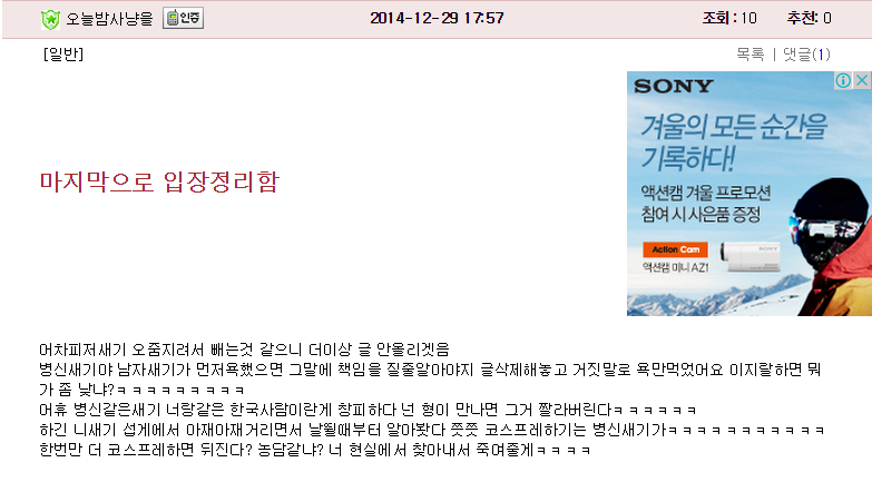 오마에.. 코로스!!!(캐삭빵의 최후)![]() ![]() ![]() ![]() 오늘밤사냥님.. 당신이 아얼의 시키인것입니까!? 좀비슬램이랑 사냥이랑 통전게에서 병림픽하다가 사냥이 캐삭빵 뜨자고 했는데 좀비슬램이 회피하고 서로 까내리다가 현피드립까지 나오고 결국엔 관리자 등장하고 사냥이 살해협박하고 관리자가 광삭하면서 사건 종결 두 분의 고향인 아즈섭게랑 하이잘 섭게에 올립니다 ^오^ |