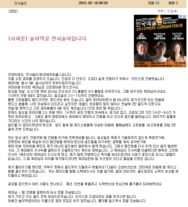 [사과문] 술이막공 전사술이입니다. (원본)![]() 태세변환 보소 본인이 잘못했을때는 그저 진심어린 '죄송합니다'라는 말 한마디면 충분합니다. 비롯 와우에서만이아니라, 바깥세상도 똑같으니, 앞으론 본인이 무슨 잘못을하시면 진심어린 말 한마디부터 건네세요.
