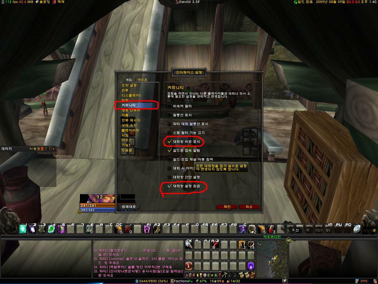 그리고 생성하는 법 그리고 채팅창 이름 바꾸는 법 그리고 채팅창 설정하는 법(보고싶은 채널 또는 보고싶지 않은 채널 등등) 방법은 간단합니다 ESC - > 인터페이스 설정 -> 커뮤니티 에서 대화창 바로 표시 - <체크 선택>마우스롤 올려 놓았을때 대화창이 바로 표시가 됩니다. 대화창 설정 잠금 - <체크 해제> 대화창설정 잠금을 해제후 채팅창이 있는 자리에 마우스를 갖다되면 투명한 네모칸 왼쪽 윗부분에 [일반] 이라는 네모칸이 뜰겁니다. 보통 처음 애드온을 깔거나 와우를 처음시작할시 [일반]챗창이랑 [전투]챗창이 [일반][전투] 이런식으로 붙어있거나 겹쳐져있을겁니다. 당황하지마시구 [일반]글자부분에 마우스 오른쪽 클릭하면 조그만 창이 뜰급니다. 1.창 잠금 해제 2.상화작용 비활성화 3.창 이름 변경 4.대화창 초기화 5. <디스플레이 설정> 글자크기 ->7~32pt 배경설정 □ -> 여러가지 색깔 선택 6. <필터설정> 설정 이렇게 뜰텐데 창 잠금해제를 하면 네모난 대화창을 자기가 원하는 위치로 이동할수잇습니다. 이동시킬때는 [일반]이렇게 적힌글에 마우스를 누른채 이동하시고 크기 변경은 네모칸 선 부분에서 마우스를 눌러 위 아래 좌우로 변경시키면됩니다. 네모칸이 투명해서 안보이면 5번의 디스플레이 설정에서 배경설정부분 색을 시커멀게 하던가 잘보이게끔해서 알아서 대화창 크기를 변경시키면됍니다. 그리고 대화창은 3~4개의 창이 있는데 길드나 파티&파티찾기 공개지역 말이 안보일경우 6 <필터설정> 설정 에서 누르시면 [범주] 1.대화 - 일반대화 /감정표현/외침/ 길드대화/귓속말/업적알림 등등 2.전역채널 - 1.공개 / 2.거래(대도시 입장시만 나타남) /3.수비 /4.파티찾기( i누르고 원하는 던젼을 선택시 채널 생성 /5.파티 3.기타 - 경험치 획득/돈획득/아이템획득/기술획득/오류/시스템 메시지 등등 여기서 체크할거 하고 안보일꺼는 체크해제하면돼고 설정하시면됍니다.
