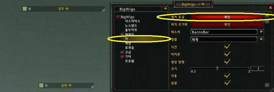 ┃ ┃예를들어 광폭화 몇분남았는지 막대로 보여주는 쿨타임바가 ┃ ┃케릭터 정가운데있어서 케릭이 안보여요 ㅠㅠ ┃ ┃여러개가 합쳐지면 한 4-5줄되면 내 케릭은 쿨타임바 저넘어로... -_-;; ┃ ┃그 쿨타임바 위치 바꾸는거랑 혹시 투명하게할수 있는 방법좀 알려주셔요... ㅠㅠ ------------------------------------------------------------------------------------- BigWigs 설정창에서 바//앵커 토글 하신다음 드레그로 이동하시면 됩니다 참고로 미니맵에 BigWigs 아이콘이 없다면 상하단 FuBar 빈곳을 우클릭후 BigWigs 찾아 설정 하시면 됩니다