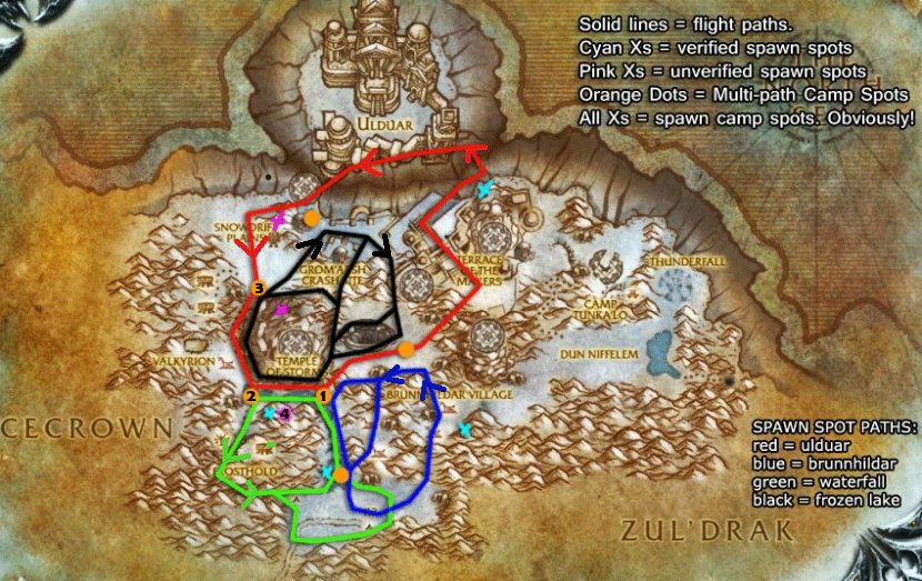 5월 26일 목요일 오전 9시 34분 - 연두색 구간으로 들어가기 위한 바이라고사 젠 확인하고 잡았슴.(위 지도 4번 지점으로 아주 높은 곳) 확인된 리젠스팟보다 좀 더 오른쪽에 있었으며, 1번 캠핑스팟에서 확인 가능했습니다. (알림이 뜬다는 의미) 스캔알림이 떴는데 주위를 둘러봐도 바이라고사가 안보이더라구요. 뭐지.. 어디지.. 1번 지점에서 얼어붙은 폭포쪽으로 보니 땅에 바이라고사의 그림자 확인. << 와우의 그림자는 지형지물을 관통합니다 ㅋㅋ >> 위쪽을 바라보니 있었습니다... =_=;;