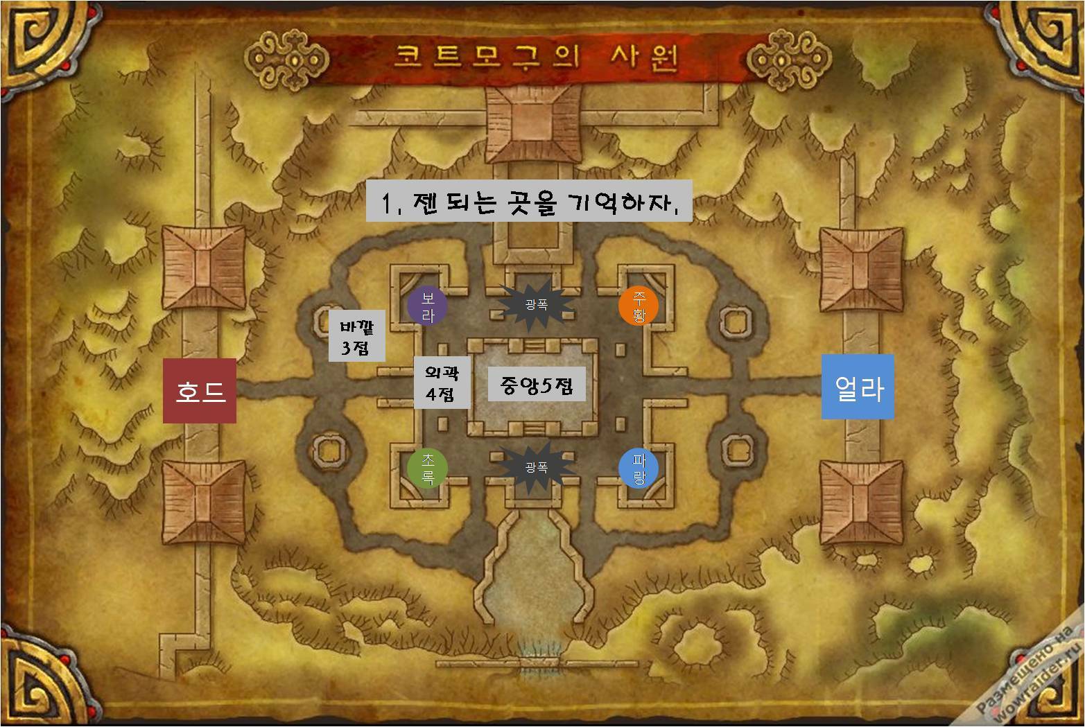 왕초보 와우저를 위한 가이드(전장기초편 )와우 pvp에는 그냥 투기장처럼 죽이면 이긴다 라는 단순한 룰이 아니라 각각 전장 맵 고유의 룰로서 승리를 쟁취하는 재미있는 곳이 있습니다 일단 전장의 개념은 너무 방대해서 http://www.inven.co.kr/board/powerbbs.php?come_idx=2368&query=view&p=1&my=&category=&sort=PID&orderby=&where=&name=nicname&subject=&content=&keyword=%C8%D6%B8%A7&sterm=&iskin=&l=385562 를 참고하시면 되겠고요 여기선 간단히 설명해 드리겠습니다 입장 방법 전장에는 10인 평점제 전장과 그냥 무작위로 매칭되는 무작위전장이 있는데 지금은 세기말이라 평전이 문을 닫았구요 무작위전장은 그냥 개인 혼자서도 신청을 할수 있고 최대 5인까지 파티를 맺어 신청할수 있습니다 전장맵은 10:10부터 시작해서 40:40등 다양하고요 무작위 전장의장점은 다양한 맵을 즐길수 있고 혼자서도 신청이 가능하기에 언제든지 쉽게 참가할수 있다는 장점이 있으나 우리팀에 똥템이 있을 확률 역시 급상승 하기에(아무나 참가하기에) 멘탈이 붕괴될 위험이 있습니다 요즘 전장은 템빨이 심하거든요 물론 이 템은 현질과는 전혀 상관없고요 적당히 오래만하면 여유있게 구할수 있는 템입니다 시즌때는 보통 2~3달걸려서 맞출수 있어요(곧 시즌이 새로시작함) 그리고 무작위 전장은 h를 눌러 입장할수 있고 정복의섬과 알터렉계곡은 제외해야 빨리 잡힙니다 평전은 사람 열명을 모아서 신청할수 있는데 호드 적을 만날수도 있고 얼라이언스 적을 만날수도 있습니다 (호드 호드끼리 붙으면 어느한쪽은 얼라이언스 역할로 바뀜 ㅋ) 또 평전은 개인마다 평점이라는 것이 있어서 그 평점을 팀에서 평균을 낸후 팀평점과 비슷한 팀을 매칭해서 붙는겁니다 평점은 이기면 올라가고 지면 내려가죠 전장맵은 다양해서 다 설명해드리기 힘들고요 거점쟁탈 전장 ![]() 위 전장은 거점쟁탈 전장에서 개인적으로 가장 재밌다고 느껴지는 아라시 전장입니다 10시와 4시 방향에 얼라이언스와 호드 본진 이 있고 중앙에 마굿간 대장간 금광 제재소 농장이 있죠?? 또 거기에 무덤표시도 되있고요 일단 전장에선 팀끼리 빠른 의사전달이 중요하기에 대장간은 대 제재소는 제 금광은 금 농장은 농 마굿간은 마 라고 합니다 (다른 전장도 거점을 첫번째 글짜만따서 부르기도합니다) 제가 말했던것들은 거점이라고 하는건데 그 거점에가서 깃발을 우클릭하면 몇초의 시전시간을 통해 거점을 점령 할 수 있습니다 이 시전시간동안 공격을 받으면 취소가 되기때문에 일단 점령만 하면 적은 인원이 수비에 남아서 (보통 1~3명) 적이 올때까지 기다렸다가 농장에 적이 5명이 온다하면 농 5 라고 챗창에 치시고 (챗창에 /전 입력해서 공대원모두에게 전달하는건 상식) 아군이 올때까지만 버텨주시면 됩니다 버틸때는 상대방을 죽이려고 하지말고 나는 생존하면서 상대방의 거점 점령을 방해(한대 툭툭 친다던지)하는것이 중요합니다 아군이 다 도착하면 그 때 적을 죽이는거죠 여튼 이 거점을 점령하면 조금씩 자원이 쌓이는데 1500점이 되면 승리입니다 물론 최대한 많은 거점을 점령해야 빠르게 점수를 쌓죠 아 그리고 죽으면 무덤에서 부활을 하는데 이 부활은 팀내 죽은인원 전원 동시에 부활합니다 30초를 주기로 전원이 동시에 부활하죠 또 무덤은 거점을 점령할수록 늘어나기에 이를 통한 전략적 플레이를 할수도 있습니다 깃전장 ![]() 제일 어려운게 깃전장이 아닌가 싶습니다 위 스샷은 전쟁노래 협곡이라고 하는 일명 노래방 맵인데 깃 전장은 적보다 먼저 우리 본진에 깃발을 3개 꼽으면 이기는 겁니다 우리 본진의 깃발은 뽑히지 않는 상태에서만이 젓 깃발을 우리 본진에 꼽을수 있습니다 적깃수를 죽이면 우리깃발은 돌아오고 이 때에 적깃발을 우리 본진에 꼽으면 1점 획득입니다 그래서 보통 공격조와 수비조로 나뉘는데 공격조는 최대한 빨리 적깃수를 죽여서 우리깃발을 다시 되찾는게 목표고 수비조는 우리깃수를 최대한 지켜서 적 공격조로 부터 적깃발을 지키는게 목표입니다 깃전장은 이 무덤이 본진 근처에 있기때문에(무덤에서 30초를 주기로 죽은 팀원 전원 동시에 부활) 수비하다가 불리하다싶으면 무덤근처로 가는게 현명합니다 무덤에서 아군이 부활하면 수비조를 도와줄수 있으니깐요 적 공격조는 무덤이 멀어서 오는데 시간이 걸리지만 우리 무덤은 근처잖아요 아 그리고 중요한 건 깃수는 시간이 지날수록 방어력이 약해지는 디버프가 중첩됩니다 오래 시간 끌면 끌수록 잘죽어요 의외로 재미있는 전장인 코트모구의 사원 ![]() 중앙에 보라 주황 초록 파랑 보이시죠? 여기에 공이 젠되는데 이 공을 들고 최대한 버티는 팀이 이기는겁니다 공은 우클릭하면 바로 들수가 있고 공을 가진상태에서 중앙에 있을수록 많은 점수를 획득 외각에 있을수록 낮은 점수 획득 또 이 공 역시 공들고 시간이 지날수록 방어력이 약해지는 디버프에 걸려서 잘죽게됩니다 심지어 힐도 잘안먹히게 됩니다 승리 포인트는 죽기싫어서 공봐도 다른사람이 먹겟지하고 미루지 말고 보이는 즉시 다 먹고있어야 이기는겁니다 고대의 해안 ![]() 고대의 해안 맵은 일단 시작할때 호드든지 얼라든지 