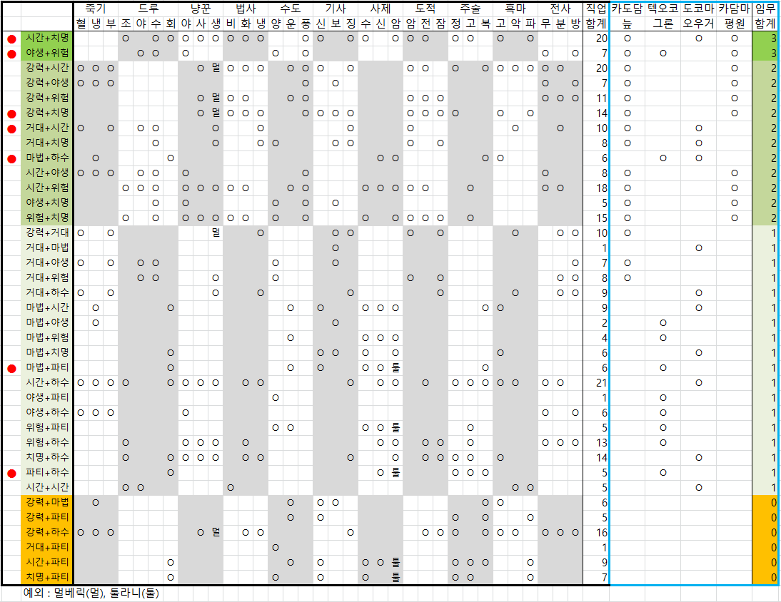 1) 본인의 영웅 등급 추종자를 하나 골라서 능력조합을 확인합니다. 2) 표의 왼쪽에서 능력조합과 일치하는 행을 찾습니다. 3) 표 오른쪽 부분의 파란 상자에서 임무별 활용가능 여부와 숫자를 확인합니다. 카도담, 텍오코, 도코마, 카담마 네 가지 임무에 따라 O가 표시되어 있다면, 낭비 없이 두 능력을 모두 이용할 수 4) 아래로 내려갈수록 임무 활용성이 낮은 능력조합입니다. 최하단 치명+파티, 시간+파티, 거대+파티, 강력+하수, 강력+파티, 강력+마법 여섯 조합은