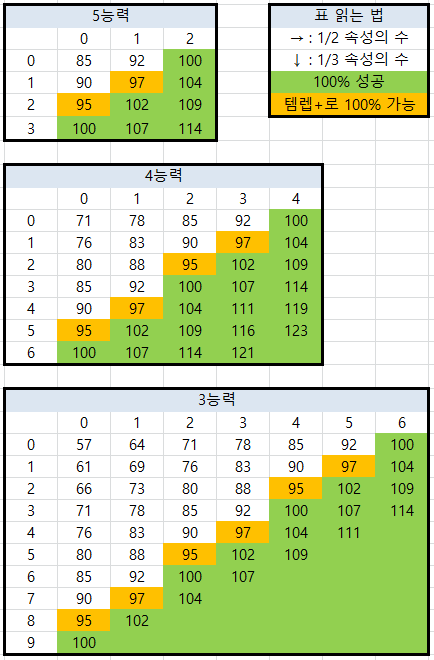 초록색은 100% 성공률이며, 노란색은 템렙 업글을 통해 100%를 만들 수 있는 경우입니다. 속성은 최대 9개까지만 적용 가능하므로 조금 수정하였습니다.