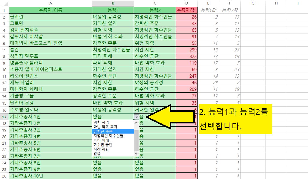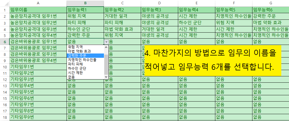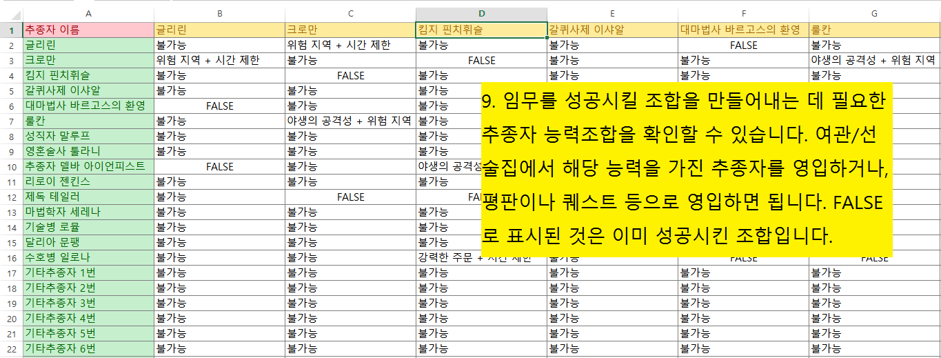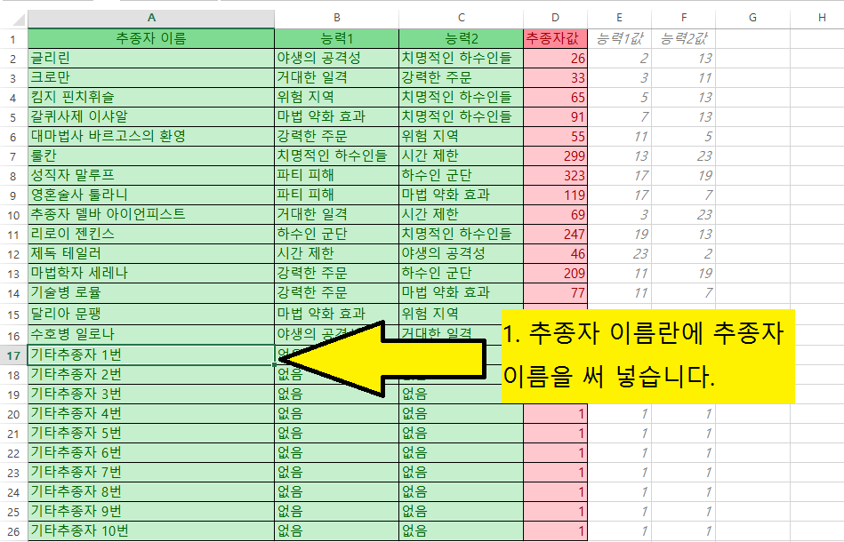 추종자조합과 필요추종자능력 쉽게 확인하기걍 심심해서 함 만들어 봤습니다 파일은 위에 첨부파일에 있습니다 용광로 임무도 입력하시면 미리 조합을 쉽게 짜볼 수 있습니다 이용법은 자료에 첨부하는 김에 그림판으로 만들었습니다