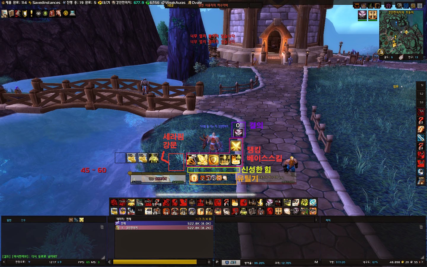 Weakaura 보기 도우미 입니다.와우의 기본 인터페이스 만으로는 보기로 탱킹을 할 때 어려운 감이 있습니다. 영광의 수호자(자신에게 힐할 때 치유량 증가)가 몇 스택인지 정의의 방패나 성보가 끊어져 있는지를 확인하려면 우측 상단을 봐야하고 스킬의 쿨을 보려면 스킬바가 있는 하단을 봐야 합니다. 게다가 결의(맞은 피해에 따라자신의 대한 치유량, 보호막 % 증가)의 맞는 강도에 따라 생존기나 서약힐 타이밍을 가늠해야하는데 기본 인터페이스 만으로는 드래그 해야 확인할 수 있습니다. Weakaura를 이용해서 기본적인 성기사의 베이스 스킬과 정패, 영광의 수호자 스택, 결의 등을 화면 한가운데 모아서 볼 수 있게 만들어 보았습니다.