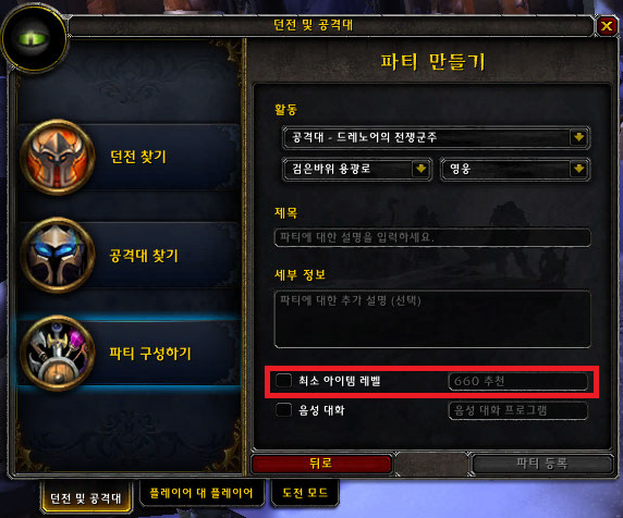 글로벌 파티 모집 시 주의사항글로벌 파티 모집 시 최소 아이템 레벨 설정이 있습니다.(빨간 테두리) ![]() 레벨을 설정해 놓으면 템랩이 안되는 사람에게는 모집글이 보이지 않습니다. 순기능으로는 템랩 안되는 사람의 신청을 사전 차단할 수 있지만 케릭을 여러개 하는 사람에게는 개똥같은 기능입니다. 같은 시간에 바로 다른 케릭으로 접속해서 캡쳐한 사진입니다. ![]() ![]() 모집 대상 케릭이 있음에도 불구하고 부케를 하는동안은 볼 수가 없어 참가를 못합니다. 레벨제한 설정 시 목록에서 제외되는 것이 아닌 참가신청 버튼 비활성 등으로 패치가 필요해 보입니다. 파티 모집하시는 분들은 제목이나 모집글에만 템랩컷을 적고 이 기능 사용을 자제해야 할것 같습니다.