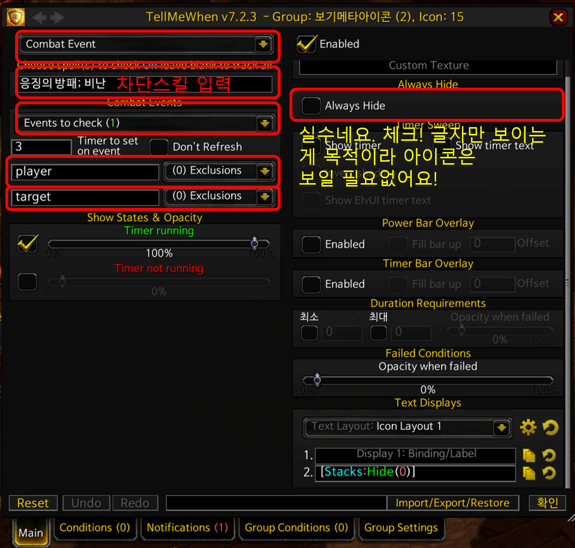 -> 차단 스킬 부분을 공란으로 + 플레이어(player)라고 적어 놓은 부분을 공란으로! + 타겟(target)도 공란으로!