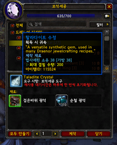 현재까지 구현된 드레노어 전문 기술(추가)전문 기술은 현재까지 많은 부분이 구현되지 않았으나.. 테스트 결과 대체적으로 이런 방향으로 흐른다 점은 참고가 될듯 해서 글을 씁니다. 1. 각 전문기술별 스탯 혜택은 제거되었습니다. 재봉 자수, 기공 손가락 등 스탯을 올려주는 사용 or 발동 효과도 포함됩니다. 2. 거의 대부분의 드레노어 전문 기술 도안은 숙련도가 필요 없습니다. 숙련도 1에서도 재료만 있다면 얼마든지 제작이 가능하며, 드레노어 템 제작을 통해 숙련도 올릴 수 있습니다. 단 탈것이나 일부 고급 도안은 만숙을 요구하는 경우도 있습니다. ![]() 3. 전문기술 만숙은 700입니다. 전문기술 600까지는 기존의 기술전문가를 통해서 등급 상승이 가능하나 700을 찍기 위해서는 초반지역 (어둠달 골짜기/서리불꽃 마루) 퀘스트를 절반 이상 완료하셔야 합니다. 4. 드레노어 전문기술 도안은 기술 전문가가 가르쳐주지 않습니다. 주둔지에서 해당 전문기술의 건물을 짓거나, 아쉬란에 있는 도안 상인을 통해서 구입이 가능합니다. (아래 스샷은 재봉술 도안 상인 위치) ![]() 5. 전문기술 도안은 골드로 구입 가능한 것도 있고, 각 전문기술별 고유 화폐를 필요로 하는 것도 있습니다. 각 전문기술별 고유 화폐는 각 전문기술 별로 존재하는 하루짜리 쿨 기술을 돌리면 나옵니다. 이 하루짜리 쿨 기술로 나오는 재료는 해당 전문기술에서 전반적으로 사용 됩니다. 아래 스샷은 보세의 쿨 기술인 탈라다이트 수정 입니다. (재봉술은 육각매듭 옷감이 주 재료인데, 쿨 기술이 아직 없습니다.) ![]() 6. 5의 전문기술별 고유 재료는 (ex: 탈라다이트 수정) 주둔지에서 해당하는 전문기술 건물을 지은후에, 주문을 통해서도 얻을 수 있습니다. 주문 후 도착하는데 1분이 소유되지만 쿨 제한은 없습니다. 재료만 있으면 얼마든지 만들 수 있습니다. ![]() 7. 5,6 과정에서 마술의 공기, 마술의 불, 마술의 물, 마술의 대지 같은 부가 재료들이 가끔 랜덤으로 생산됩니다. 이 재료는 좀 더 고급 아이템을 만들때 사용됩니다. 전물기술별 고유 재료와는 달리 귀속이 아니기 때문에 거래도 가능합니다. 8. 각 전문 기술별 고급 아이템에는 추가적으로 파템 비밀 재료가 필요합니다. 이 아이템의 입수 경로는 아직 알려지지 않았습니다. (640 -> 655 업그레이드 키트 제작등이라던지 고급 아이템 제작에 들어갑니다.) 9. 완성되지 않은 전문기술들이 많지만, 대체적으로 모든 전문기술이 이 틀에서 벗어나지 않습니다. 주문이나 하루짜리 쿨을 기술 통해서 전문기술 별 재료를 만든 후, 부가재료를 섞어서 아이템을 생산하는 방식이 됩니다. 참고로 제작 아이템은 모든 전문기술을 합쳐서 3부위만 장착이 가능합니다. (현재 망토는 예외긴 한데 버그로 추정됩니다.) 10. 주둔지에 배우지 않은 전문기술 건물을 지어도 고유 재료 주문이 가능하며, 다른 전문기술 아이템을 만들 수 있습니다. 단 업그레이드 키트, 탈것 등 고급 아이템 제작은 제한이 됩니다. 11. 전문기술별 고유재료를 만드는데 필요한 1차 재료는 드레노어 이전과 흡사합니다. 약초, 광석, 물고기, 가죽 은 그대로이며, 옷감은 모피로 변경 되었습니다. 옷감과 다르게 드레노어 전역의 동물형 몬스터를 사냥해야 드랍합니다. 약초, 광석은 채집, 가죽은 무두질, 물고기는 낚시, 모피는 사냥을 통해 획득해야 합니다. 12. 단, 약초와 광석은 주둔지에서 약초밭과 광산을 잠금 해제 하면 생산할 수도 있습니다. 광산은 92레벨에 잠금 해제가 가능하며, 약초밭은 96레벨에 잠금 해제 됩니다. 주둔지에 낚시터가 있고, 알려진 정보에 따르면 물고기도 하루에 한번씩 배달된다고는 하는데 아직 베타에는 구현되지 않았습니다. 중요한 점을 다시 정리하자면 - 초급 드레노어 재작템은 전문기술 숙련도와 관계 없이 제작 가능하며, 주둔지에 건물을 지으면 해당 전문 기술이 없어도 생산할 수 있습니다. - 고급 제작템은 해당전문 기술이 필요합니다. 극히 일부 도안은 숙련도를 요구합니다. - 숙련도는 크게 의미를 가지지 않습니다. - 즉, 전문기술의 가장 큰 의의는 제작이라고 보시면 됩니다. (다만 기공의 경우는 어떨지 모르겠군요.) ![]() 보너스. 가방계의 혁명을 불러올지도 모르는 30칸 가방의 재료. - 육각매듭 옷감 10: 호화로운 모피 x 40 (주둔지 주문) - 마술의 대지 5: 육각매듭을 옷감을 만드는 과정에서 생산이 됩니다. ---------- 빼먹은게 있어서 내용을 추가합니다. 해당 전문기술을 습득 한후 드레노어에서 사냥하다 보면 아래와 같이 전문기술 숙련도를 올릴 수 있는 아이템을 드랍합니다. ![]() 요구하는 재료를 가진 상태로 해당 아이템을 사용하면, 녹색 아이템이 하나 생성되며 이 아이템을 주둔지에 있는 엔피씨에게 반납하면 5의 숙련도와 함께 8~15개 정도의 주둔지 자원을 줍니다. (반납으로 숙련도는 600까지만 오릅니다) 중요한 부분인데 빼먹어서 추가합니다. 수정 2. 마술의 ~ 시리즈는 교역소에서는 아직 획득할 수 없습니다. 수정 3. 드레노어 도안을 숙련도 11에서 배우면 이렇게 됩니다. 숙련도 600이 넘도록 이 상태가 유지됩니다. ![]()