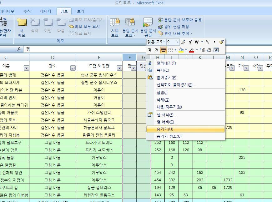 6. 숨기기 취소 (숨겨진 열 양 옆포함을 잡고 마우스 우클릭 숨기기 취소 입니다)