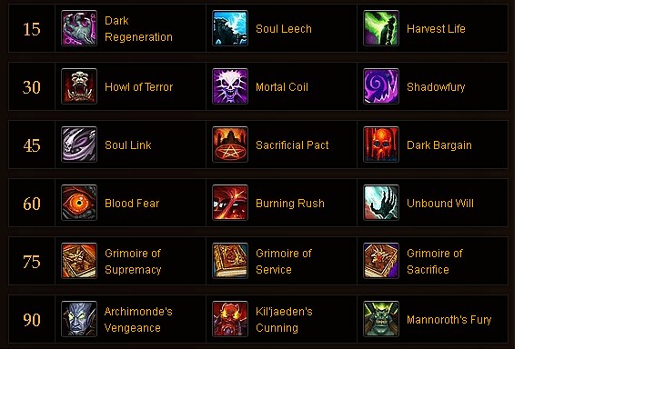 판드리아 흑마특성 변경 정리![]() 15렙(회복 관련 카테고리) 1.어둠의 재생력 - 즉시시전 3분 쿨 '전체' 생명력의 50% 만큼을 20초 동안 회복. 20초동안 받는 치유량이 25%만큼 증가. 2.영혼 착취 - 패시브 어둠의 화살, 소각 그리고 사악한손아귀가 입힌 피해량의 15% 만큼 시전자의 생명력을 회복. 3.생명거두기 - 정신집중 대상과 대상 주위 15미터 이내의 모든 대상에게 초당 107의 암흑 피해를 입히고 시전자의 생명력을 초당 4%씩 회복, 6초 지속 생명력 흡수를 대체 레벨 30(상대메즈 관련 카테고리) 1.공포의 울부짖음 - 즉시시전 40초 쿨 울부짖어 10미터 이내 5대상을 8초 동안 도망가게 함. 피해로 인해 효과가 사라질수있음. 흑마법사가 피해를 입게 되면 피해를 입을때마다 1초의 대사용 대기시간이 감소함. 2.필사의 고리 - 즉시시전 45초 쿨 대상에게 공포를 주어 3초 동안 도망가게 함. 대상이 공포에 걸리면 시전자는 전체체력의 25%만큼 회복 3.어둠의 격노 - 즉시시전 30초 쿨 어둠의 격노를 방출하여 8미터 범위의 모든 대상을 3초 간 스턴시킴. 레벨 45(생존 관련 카테고리) 1.영혼의 고리 - 즉시시전 작동되면 흑마법사가 받는 피해와 치유효과가를 악마소환수와 공유함. 이 효과는는 막을 수 없음 악마소환수를 조작가능하고 활성화 되어 있는 동안 지속. 2.희생의 계약 - 즉시시전 1분 쿨 소환한 악마의생명력을 50%만큼 소비시켜 흑마법사에게 소비된 소환수 체력의 300%에 피해를 흡수하는 보호막을 생성. 3.어둠의 거래 - 즉시시전 3분쿨 방어막이 생겨 10초간 모든 피해를 방어함. 방어막이 사라질때 방어막이 흡수한 피해의 50%만큼이 20초에 걸처 데미지로 돌아옴. 레벨 60(생명력 소비 관련 카테고리) 1.피의 공포 - 즉시시전 공포가 즉시시전이 되지만 최대 생명력의 10%만큼을 소비함. 공포를 대체 2.불타는 돌격 - 즉시시전 작동 하면 매 초당 전체 생명력의 5%만큼씩 소비되며 작동하는동안 이동속도가 50%만큼 증가함. 취소할때까지 작동 합니다. 3.해방된 의지 - 즉시시전 20초 쿨 즉시 기절, 방향감각상실, 이동불가, 마법효과가 사라짐. 흑마법사 최대 생명력의 25%만큼을 소비합니다. 레벨 75(소환수 관련 카테고리) 1.우월의 마법서 - 즉시시전 보통의 하수인을 대신하여, 더 강력한 악마를 지배함. 이 악마는 10%의 추가적인 피해를 입히고 더욱 강력한 기술을 가지고 있음. -펠임프 소환(임프 변형) -보이드로드 소환(보이드워커 변형) -쉬반 소환(서큐버스 변형) -비홀더 소환(지옥 사냥개 변형) -분노의 수호병(지옥 수호변 변형) -어비썰 소환(지옥불 정령 변형) -테러가드 소환(파멸의 수호변 변형) 2.복종의 마법서 - 즉시시전 2분 쿨 30초 동안 싸우는 두번 째 악마를 즉시 소환함. 3.희생의 마법서 - 즉시시전 2분 쿨 소환수를 희생시켜 15분 동안 흑마법사의 공격력과 체력이 증가함. 다른 악마를 소환시 효과가 취소됨. 레벨 90(특수 카테고리) 1.아키몬드의 복수 사용시 -적에게 저주를 내려 흑마법사가 받는 모든 피해의 30%만큼을 저주를 내린 대상에게 입힘. 10초 동안 지속 패시브 -흑마법사가 받는 모든 피해가 공격하는 대상에게도 5%만큼 가해짐. 사용효과 쿨타임이 돌어왔을때만 작동함 2.킬제든의 교활함 - 패시브 이동하면서 주문을 시전하거나 정신집중을 할 수 있음. 그러나 주문 시전시간과 주기적인 피해를 입히는 주문의 간격이 두배로 증가함. 3.마나로스의 분노 - 즉시시전 2분 쿨 특성과 상관 없는 광역 마법의 범위가 200%로 증가함.