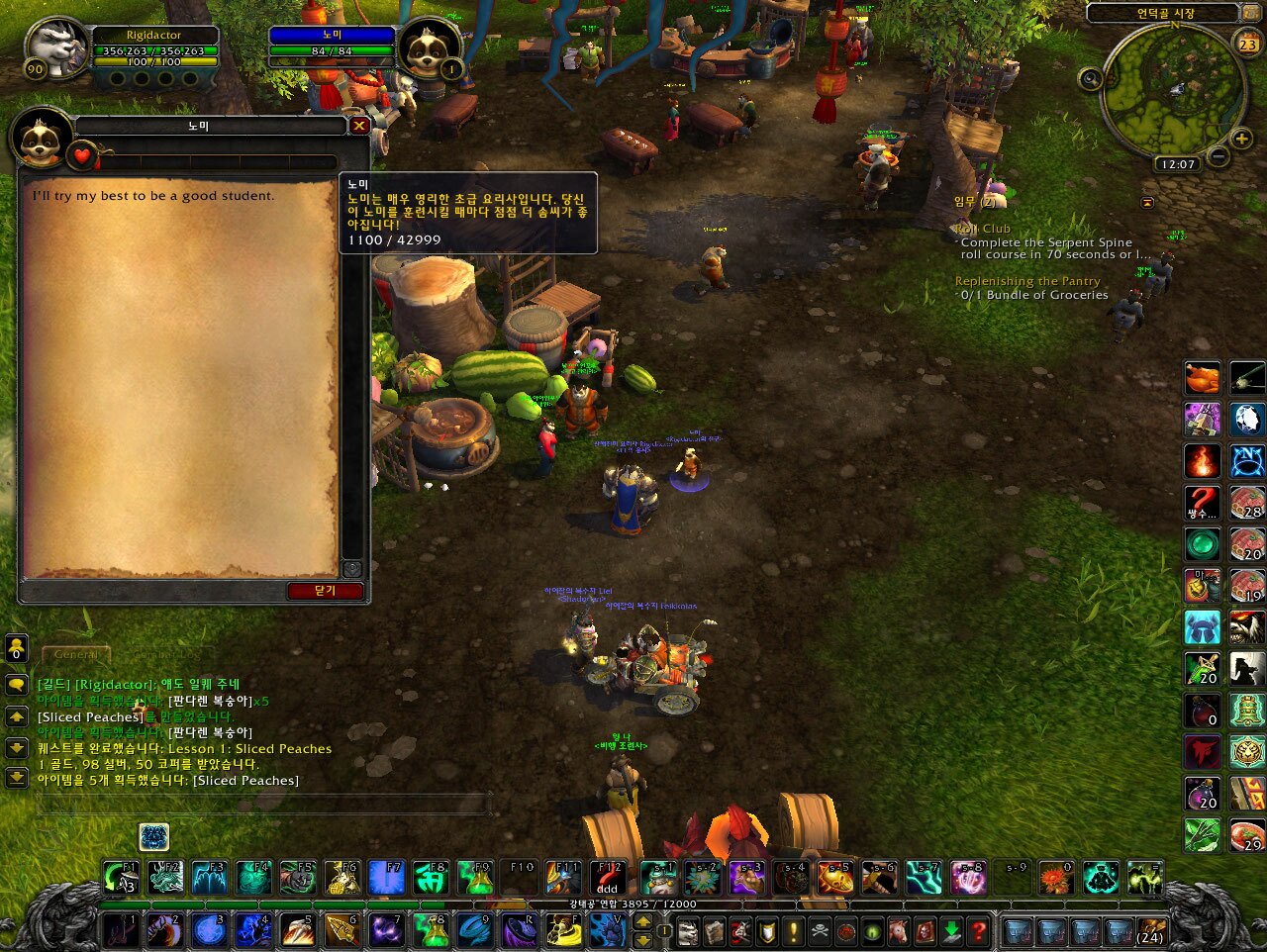 요리상 100개로 사는 Cooking school bell![]() 판다리아 요리상 100개로 사는 Cooking school bell입니다. 사용하면 꼬꼬마판다렌인 노미를 소환합니다. ![]() 별로 귀엽진 않네요.. 아무튼 얘는 하루에 1개씩 요리를 배워보겠답시고 우리보고 요리 재료를 사달랍니다. ![]() 성가신 녀석 같으니... 요리 재료인 판다렌 복숭아 5개를 사줍시다. ![]() 요리를 만들어서 주긴 줍디다. 별 쓸모는 없지만. 아무튼 주고 나면 노미의 숙련도가 1000 (평판으로 취급되서 그런지 길드 혜택으로 +10% 해서 1100까지) 오릅니다. ![]() 다른 농부들 호감도와 마찬가지로 총 42999까지 올릴 수 있으므로 다 올리는데는 43일 (길드 평판 보너스가 있으면 40일) 이 걸릴 것으로 예상됩니다. 숙련 다 올리면 과연 무슨 요리를 만들어낼지 기대가 되네요. 숙련이 오르면 복장도 바뀔려나. 참고: 펫인 줄 알았더니 펫이 아니라 인벤토리에 넣어둔 아이템으로 소환하는 겁니다. 참고2: 현재 버그인지는 모르겠지만 일퀘로 숙련을 올려준 후 이걸 다시 환불했다가 사도 숙련도가 유지가 됩니다. 다음날 새 일퀘를 줄 때까지 유지가 되는지는 모르겠습니다. 참고3: 이거 얻으려면 정말 똥빠지게 요리재료 갖다바쳐야합니다. 요리상 100개 = 야채 1만개 = 고기 or 물고기 2천개 = 황금잉어 6천개...