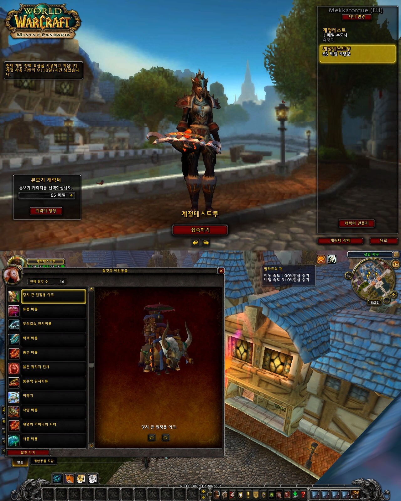 서버는 베타 Mekkatorque(EU)이며, 90레벨이 있는 캐릭과는 다른 서버입니다. 레벨1짜리 캐릭으로 테스트를 해본결과, 위의 그림과 같이 탈것들과 펫들이 공유가 되어있음을 확인할 수 있었습니다. 하지만, 탈것의 수가 왜 늘어났는지는 확실한 이유를 잘 모르겠네요 ^^; 아무튼 공유는 되는것 같습니다.