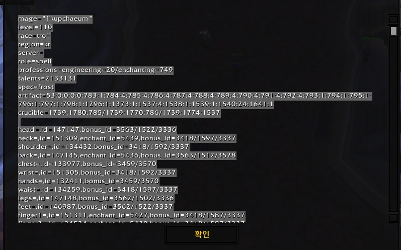 simcraft 애드온을 가지고 문장열을 얻은 모습