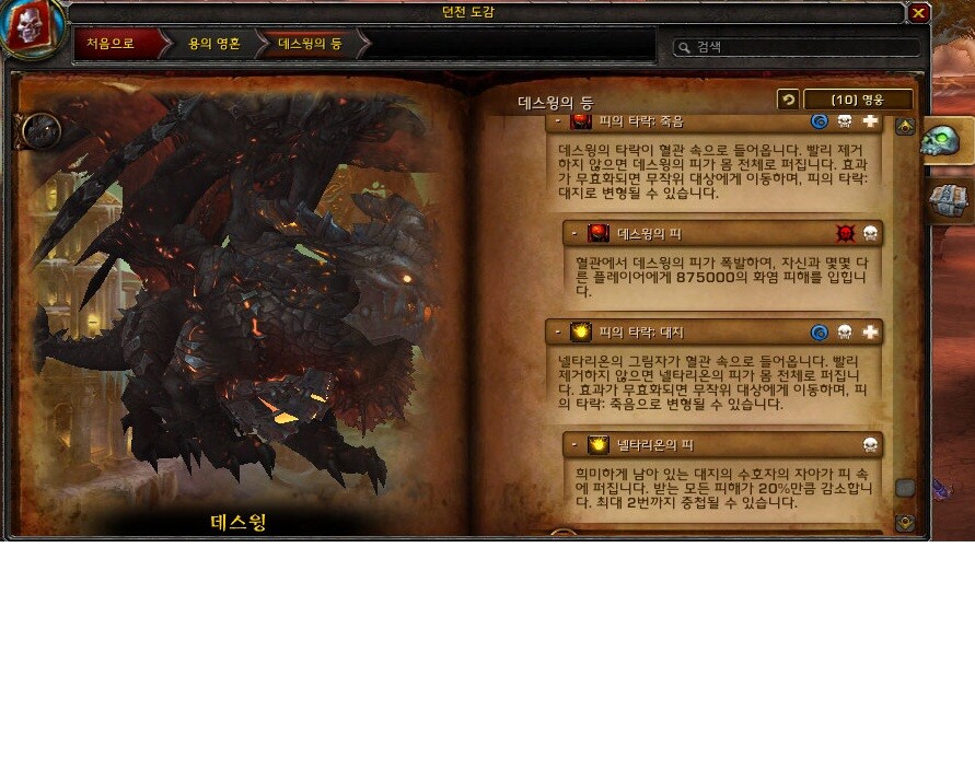 요즘 용의 영혼이 전체 5% 너프가 되고 데스윙의 등 힘줄의 피통이 15% 너프가 된 이후로 데스윙의 등을 공략 완료하신 분들도 많겠지만 너프 후 공략을 하는 공대가 많을 것 같아 글을 올려봅니다. 큰 도움은 되지 못할지라도 작은 도움이나 되었으면 좋겠네요.