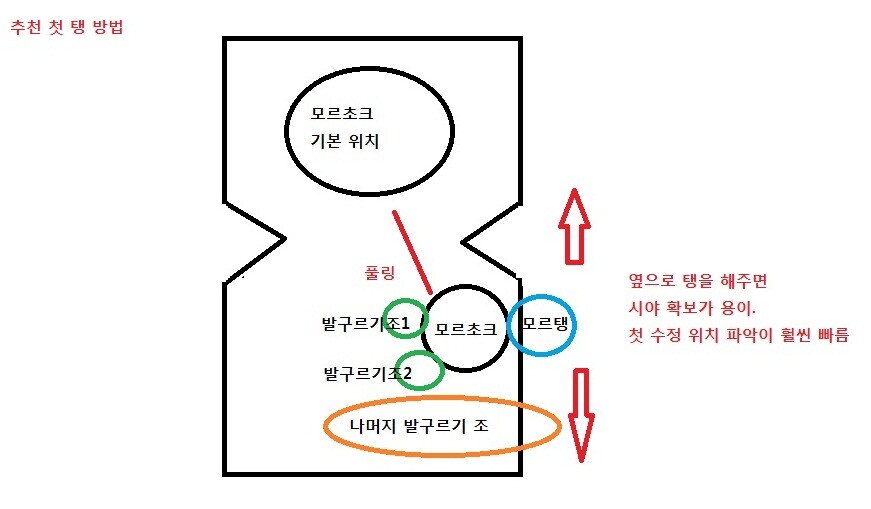 분신쪽 첫 수정 위치는 거의 고정입니다. 첫 모르초크 위치 기준으로 좌측이기때문에.. 처음에 좌측으로 쭉 빼주시면 좋고 쭉 빼더라도 너무 앞쪽으로 나가지 마시고 처음 모르초크 바라보는 기준.. 뒤쪽으로 자리 잡고 본진은 반대로 탱해주시는게 좋습니다.