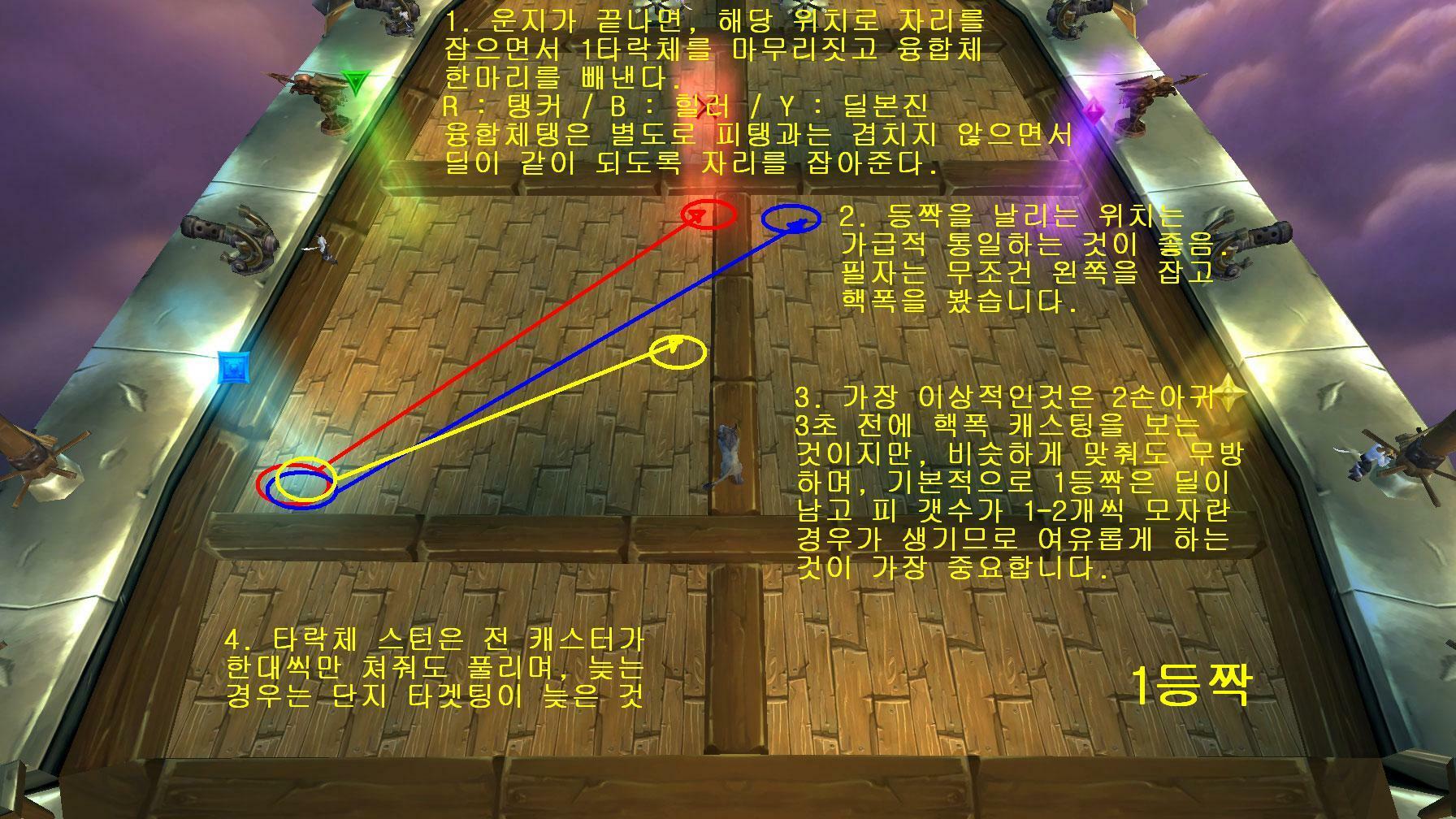 이후 자리 배치는 위 그림처럼 됩니다. 노랑에는 원딜이 전부 배치되며, 파랑색에는 힐러가, 붉은색에는 피탱커가 가고, 단 붉은 원은 피탱커의 자리라기보다는 피탱커가 피를 까는 자리입니다. 헷갈리시면 안되요. 저렇게 자리를 잡는건 몇가지 이유가 있는데, 일단 노란색의 경우 움직이지 않고 핵폭발 반경을 피할수 있는 사거리 상에 위치하여 딜효율을 높히며, 힐러의 경우 대부분의 피들이 힐러 어글을 보고 오기때문에 피탱에 최대한 밀착하되, 공대 전체가 왼쪽으로 치우쳐 있으므로 기울임 카운트를 띄우지 않게 하기 위해 오른쪽으로 배치 합니다.