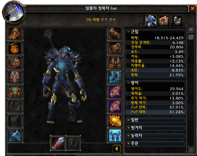 Ise.zip [54Kb] 판다리아의 안개 딜전사 PVP에 관하여(스압)[파일첨부 수정]☆★☆★☆★☆★매크로 & 단축키 원하시는 분은 ▲위에 첨부파일 다운 받으시면 됩니당ㅇ.ㅇ!★☆★☆★☆★☆ *먼저 세팅파일 다운받으셨는데 어떻게 하는지 아리송한 분들께. 'Ise'폴더는 제 전사 캐릭터 설정 폴더니까 안에 있는 것을 모두 복사해서 /World of warcraft/WTF/Account본인 계정본인 캐릭(역슬래쉬 안먹혀서 슬래쉬로 대체합니다. 착오없으시길) 의 경로에 풀어놓으시면 됩니다. 애드온은 icicle, MoosiAlert, Platebuff, OmniCC, xArena 정도 쓰시면 굉장히 편해요 전사 PVP에 관한 전반적인 썰을 풀어볼까 합니당 무기/분노 모두 좋아하지만 투기장에서는 거의 무기로 플레이합니다 ㅇ.ㅇ 굉장히 주관적인 시각으로 쓴 글이며 반박보다는 제 글을 깨부수는 더 좋은 팁글을 기대합니당 ![]() 아주 스탠다드한 세팅입니다. 투기템은 전문기술 제외하고 빨강홈 3 노랑홈 3 파랑홈 3 얼개1 이지요 저는 대장이므로 손목과 손에 소켓을 하나씩 더 뚫었고 허리까지 죔쇠를 사용해서 다색소켓 세 개 추가 총 12개입니다 얼개는 불가사의의 원시 다이아몬드(치명타 +432/이동방해,불가효과 지속시간 10% 감소), 빨간홈 두개는 굵은 운룡의 눈(힘 +320), 나머지 하나에는 조밀한 황제의 자수정(힘+80, 위력+160) 노랑은 선명한 거친 비취(위/탄 +160), 파랑은 휘몰아치는 강의 심장(위력 +320) 마부 역시 가장 구하기 쉬운 것들입니다. 장갑 힘 +170, 손목 특화 +170, 망토 치명타 +180, 발 판다렌의 발걸음(이속+특화) 기타 키트들은 설명드리지 않아도 되겠지요. 재연마 우선순위는 치명타>숙련입니다 다음으로 특성에 대해 말씀드릴게요 ![]() ![]() 제 특성과 문양이빈다ㅇ.ㅇ 투기장 뛰던 그대로의 세팅이구요. 각각의 기능은 굳이 설명드리지 않아도 되리라 생각합니다 ![]() 요것은 제 단축바. 거의 전부가 mod 명령어를 사용한 매크로들이며 좌상단 단축바에 있는 스킬들은 사용하기 위한 것이 아니라 shift, ctrl, 혹은 alt를 눌러야만 보이는 스킬들의 쿨을 보기 위해서 꺼내놓은 겁니다. 혹시나 제 매크로나 단축키 공유를 원하시는 분들은 보내드릴게요 ㅇ.ㅇ 없으리라 생각하지만.. 음. 제가 생각하는 판다 전사의 컨셉은 '홍명보'입니다. 적절한 탈출기와 힐러 해제지원만 있으면 못 가는 곳이 없죠 무장해제와 충격파, 날고, 혹은 충격의 외침, 대규모 주문 반사, 위협의 외침, 사기의 깃발 수비대장(개인적으로 이건 진짜 사기급 이동스킬입니다) 등등 필요할 때는 무지막지한 폭딜러로 돌변합니다.(사실 이 부분이 너무나도 압도적이라 다른 면이 가려집니다) 전사가 딜을 하려면 당연히 밀착해야 합니다. 5미터, 전사가 미친 짐승으로 변하는 거리죠 2:2기준 딜+힐 조합으로 딜+딜 조합에는 거의 필승할 수 있습니다.(냥냥이나 법법은 예외로 칩니다. 그런데 제가 이런 생각을 할 수 있다면 다른 무수한 전사님들도 이런 생각을 하시겠죠? 1500만 넘어가도 거의가 딜+힐 조합입니다. 흔히 말하는 병림픽이 매판 펼쳐지지요 굳이 전+힐 조합이 아니라도 냥+힐, 법+힐(이건 캐릭이 파일럿 빨을 많이 받습니다만), 고흑+힐(사람 미칩니다), 야드+힐(...............).. 이런 사람 복장 뒤집는 조합이 많죠. 때문에 딜+딜 조합은 굳이 큰 택틱이 필요가 없습니다. 물론 쉽냐고 말씀하시면 아니라고 말하겠습니다. 맞고 있으면 똥줄이 타요; 지금 딜러들은 쿨을 켜면 일부 하이브리드 클래스를 제외하고는 정말 미친듯한 딜을 보여줍니다. 클래스에 따라 차이는 있지만 풀쿨로 힐 못받는 상대를 못 녹이면 바보라고 할 정도죠 ㅎ.ㅎ 그렇기 때문에 '내가 풀쿨을 마음놓고 쓸 수 있는 환경 만들기'가 판다 PVP의 핵심이 되겠습니다. "언제는 안 그랬느냐?" 라고 말하신다면 저는 "오리 고술 이후로는 한 호흡에 만피까는 클래스를 본 적이 없다."고 대답하겠습니다. 아 리분 분무기는... 예. OP 맞습니다. 그치만 한시즌도 못 해먹고 칼질 당했으니 저를 위해서 모른척 해주세요 ㅇ.ㅠ 본론으로 돌아가서 내가 맘놓고 딜할 환경을 만들기 위해선 첫째, 상대가 피를 회복하지 못하도록 해야 한다. 둘째, 상대가 나에게 메즈를 하지 못하도록 해야 한다. 셋째, 상대의 탈출기가 빠진 틈을 노려야 한다. 당연한 소리죠? 하지만 저는 이게 제일 힘들었습니다. 다들 저만큼, 혹은 저 이상으로 머리들이 좋으시니까요 때문에 저는 쿨과 쿨의 좁디좁은 틈을 노리기보단 상대가 쿨(딜쿨이든 메즈쿨이든)과 점감을 쏟아내도록 유도하고 그 쿨을 어떻게 잘 받아 넘기느냐에 중점을 두었습니다 때문에 문양칸에 사람 빡치게 하는 방벽문양이 떡하니 박혀있는 것이죵.ㅇ.ㅇ 쿨이 안돌아옵니다. 그치만 판다 딜러들의 쿨기 역시 텀이 길어졌기 때문에 저는 쓸만하다고 생각합니다. 딜+딜 조합의 살떨리는 딜이 힐러에게 박힌다면(전+사 같은 마이너 조합도 저는 가리지 않스빈다!) 딜딜을 만나면 경계를 찍는 경우도 종종 있습니다. 생존률이 대폭 상승하죠 ㅇ.ㅇ 그리고 전사의 메즈.. 외침류, 무장해제, 충격파 등등. 저는 다 메즈기라고 부릅니다 이런 메즈기들이 예를 들어 다섯개라고 칩시다. 근데 다섯개 중에 한개만 광역메즈가 가능하