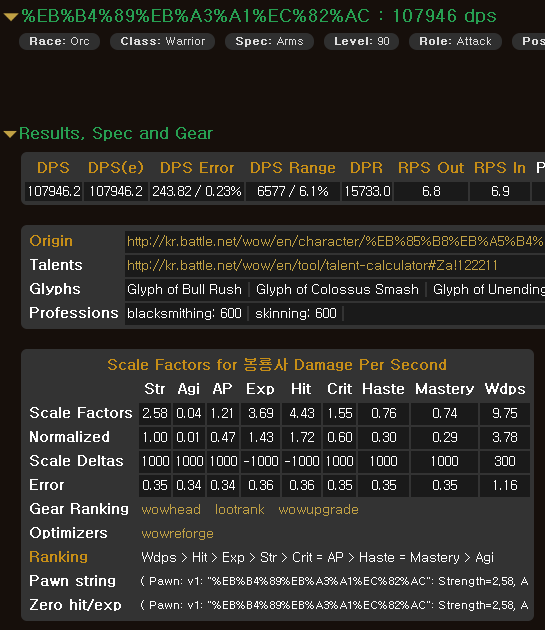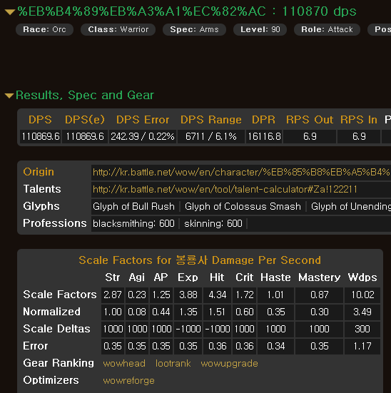 템렙은 8이나 차이나는데 심크결과는 11만dps 대 10만8천 dps로 쥐똥만큼 밖에 차이가 안나죠? 무기영향이 그만큼 크다는 이야기입니다. (scale factors의 Wdps도 눈여겨보시기바랍니다) 만약 전사여러분들중, 운속하드도검 쌍수를 구하기는 힘들고.. 상급별부자가있다면? 저는 무기전사 한번쯤 해보는걸 추천드립니다.