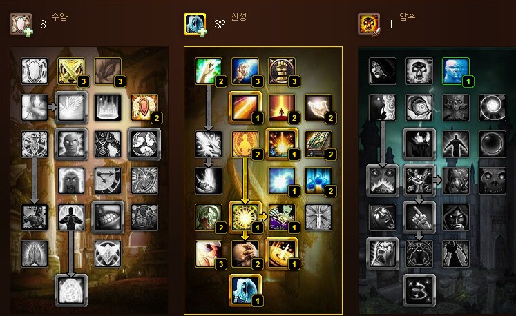 1. 소생에 관한 특성 개인적으로 소생을 쓰는 비율이 낮기 때문에 소생 쪽 특성은 소생 연마(소생 치유량 증가) 외에는 안찍었습니다. 천상의 손길(소생 시전시 총 치유량의 10% 즉시 치유)은 소생 총 치유량의 10%가 1000~1500 정도 밖에 안되는 미비한 양이라 안찍었고 신속한 소생(소생 글쿨 0.5초 감소)은 소생 글쿨을 0.5초 감소시켜서 소생을 난사할 경우가 없기 때문에 안찍었습니다. 2. 신의권능 : 보호막에 관한 특성 무빙이 중요한 대격변 레이드 특징상 육체와영혼(보막 시전시 이속 증가)은 매우 유용한 특성이라고 생각하구요. 수양 쪽 영혼의수호(보막 쿨 감소)과 콤보로 무한육영보막이 가능합니다. 영혼의수호를 꼭 찍을 필요는 없다고 생각하는데 육영보막이 필요한 상황에서 보막 쿨이 돌고 있을 때의 답답함 때문에 저는 다 찍었습니다.