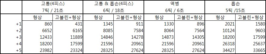 T14 4피스에 따른 암흑사제 가속값질문글을 몇번 보기도 했고... 이래저래 오해들도 많은듯 해서 정보 공유차원에서 올려드립니다 기본적으로 T14 4피스는 현재 가속에 의한 틱증가 +3초가 아닌 기본 +1틱(3초) 증가 후 가속에 따라 틱이 증가 하는 형식입니다 가속 0, 노형상 기준 흡손은 15초 5틱에서 18초 6틱으로 증가하고 고통은 18초 6틱에서 21초 7틱으로 증가합니다 (4피스 흡손은 4피스가 아닐때 고통과 틱 증가가 정확하게 일치합니다) 현재 T14레이드에서는 여전히 8085 정도가 무난한 가속일듯 싶고, h2p에서도 이유는 다르지만 8085(4피스시 흡손, 4피스가 아닐시 고통 +2틱)를 기본 목표로 삼으라고 나와있습니다 참고로 가속에 따른 틱증가는 다음과 같습니다 ![]()