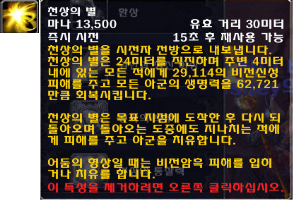 쿨타임은 15초로 굉장히 짧고, 별을 발사하여 전방 30미터를 훑고 나가면서 한번, 그리고 다시 사제에게 그 별이 돌아오면서 한번, 총 한대상당 두번의 힐을 하게 됩니다.