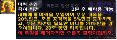 마력주입은 전통의 수양사제 고유의 스킬으로써, 뒤틀린 운명보다 효율이 좋지 않지만, 특정구간에서 사용할 수 있습니다.