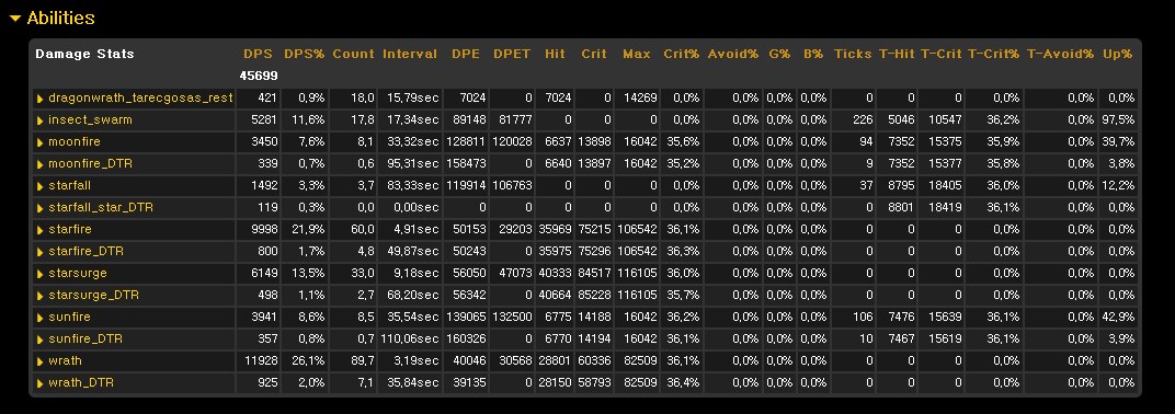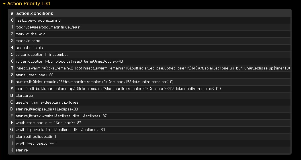 의도 유무, 스펙에 상관없이 별똥별을 월식때만 사용 것이 DPS 300~400정도 높았습니다. 심크상 기본적으로 입력된 T13 드루이드 딜사이클 상으로는 별똥별을 월식 전환 직후가 아닌 월식 전환 직전에 사용하도록 되어있는데 월식전환직후에 사용하도록 시뮬해본 결과, 아주 미세하게나마 월식 직전에 사용하는 것이 더 높았습니다. 울트락시온 하드모드를 감안하여 전투시간을 200초로 단축시켜 실험한 결과, 역시 300가량의 DPS차이로 월식때만 사용하는 것이 더 높았습니다.