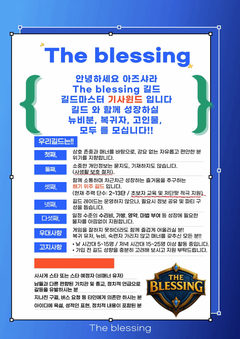 ✅️ The blessing ✅️ 길드원 모십니다![]() 다른 서버 는 아래의 오픈톡으로 문의 부탁드립니다 아즈샤라 서버 는 /누구 The blessing 하셔서 길드 가입 요청 하시면 됩니다