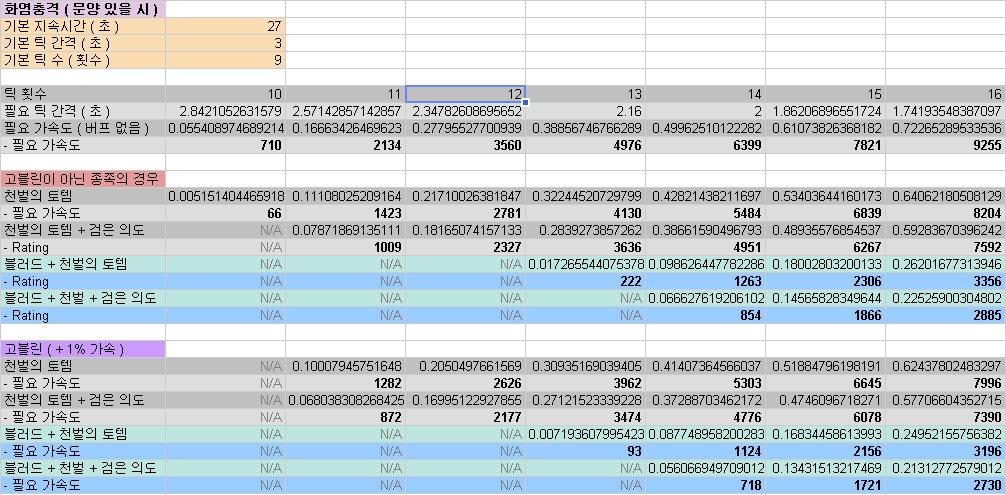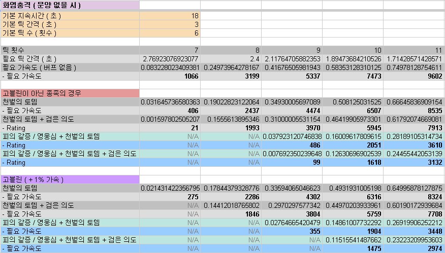 [4.2][정기 주술사] 화충 틱수와 필요 가속도.* 출처는 구글 문서의 외국 자료를 번역한 것입니다. * 이 자료는 반쯤은 밑에 올라온 실험글을 보고, 반쯤은 썬더치킨님을 위해서 작성했습니다. 얼마전에 DPS 관련해서 술게에서 헤프닝이 있었는데요, 사실 국내 직업 포럼이 모두 비슷합니다만, 특히나 술게의 경우 DPS 에 대한 연구 글이 많이 올라오지 않는 편입니다. 고술 관련 글에서는 썬더치킨님이 고생하고 계셨던것도 사실이고, 해당 사건에 대해서는 불미스러운일로 남게 된것이 사실입니다만 저 역시 인벤 술게도 활성화 되었으면 하는 바램에서, 자중하시겠다고 떠나신 썬더치킨님이 돌아오셨으면 하는 마음에서 올려봅니다. 안녕하세요, 샤아입니다. 술사에게 가속도 셋팅은 참 머리 아픈 일이 아닐수 없는데요, 적중의 경우 다른 직업과 마찬가지로 맞추면되기 때문에 1742 라는 수치가 명확하게 밝혀져 있습니다만, 국내 포럼에서는 아직 정기 주술사나 복원 주술사의 정확한 셋팅값에 대해서 수식을 통해 산출된것이 없습니다. ( 결론부터 말하자면 밑의 글이 어떤 자료를 토대로 한것인지는 모르겠습니다만 아주 정확합니다. 다만 시트로 정확하게 정리된것을, 그리고 버프와 버프가 없음을 토대로 어떤 가속이 필요한가를 정리해드리기 위해 올려봅니다. ) 먼저 첫번째는 제가 최근에 시작한 관계로 -_- 정기 주술사의 화염 충격입니다. 레이드에서 가장 정확하고 효율적인 화염충격의 활용은 화염충격의 마지막 틱 데미지가 들어가는것을 보고 화염충격을 넣는것입니다. ( 참, 여담입니다만 레이드유저를 위한 자료입니다. PvP 에서 활용은 제가 기량이 부족한 관계로... ) 하지만 정말 쉽지 않은 일이고... 이 자료를 통해서 디버프 아이콘의 남은 시간을 보고 넣는것이 가능해 질것입니다. ![]() ( 정기의 깨달음이 변경된 자료는 제외 되어 있습니다만, 정기의 깨달음과 화염충격을 같이 돌리는 상황이 제한적이고 고급 컨트롤인 만큼 일단 고려하지 않았습니다. ) 화염충격의 기본 틱수는 문양이 없을때 6회입니다. 표를 참고 하시면, 버프가 없고 고블린이 아닌 종족이 천벌의 토템만을 깔았을 시 ( 기본적으로 이 상태일 겁니다. ) 7틱으로 늘리기 위한 가속도는 1066 입니다. 이 상태에서는 틱간격이 약 2.7 초입니다. ( 정설인 화충이 6초 남았을때 리필하라는 이야기는 2틱 남았을때 1틱 놓칠수도 있으니 보험삼아 그때 넣으라는 겁니다. ) 즉 화염 충격이 3초 남았다는 아이콘을 보기 전에만 리필해 주시면 됩니다. 2437 이라는 가속도는 지금은 많은 분들이 만들기 어려운 수치인데요, 검은 의도를 염두에 두게되면 1993이라는 가속도로도 8틱으로 늘릴 수 있습니다! 8틱이라는 수치가 거의 한계에 가까운 수치가 되는데요, 사실 이렇게 해도 틱간격이 2.4 초에 해당하므로... 활용도는 3초 남았을때 리필하는것 은 변함이 없습니다. 아마도 데스윙 잡을때까지는 이렇게 사용이 되지 않을까 점쳐봅니다. 그러나 정기 주술사의 경우 번개 촉발 문양이 추가 되었습니다만, 아직도 화염 충격 문양은 인기 문양입니다. 이번에는 화염 충격 문양이 있을때를 고려한 자료를 살펴 보겠습니다. ![]() 문양의 유무에 따라 상당히 많은 변화가 있습니다만, 기본적으로 활용 방법은 똑같습니다. 모든 가속도 관련 버프를 활용한 고블린 + 블러드 + 천벌 + 검은의도를 가진 경우 2730 이라는 수치 ( 이것도 불가능해보입니다만 ;; ) 로 16 틱이라는 결과를 낼 수 있네요. 틱간격이 1.7초이니 아마 DPS 관련해서도, 활용에서도 2초 아이콘을 보고 넣게 되니 저 수준의 가속을 가진 정술이면 상당한 DPS 를 뽑아 낼것 같습니다. 단순히 스프레드 시트이니 딱히 어떤 조언이나 팁을 말씀드리기는 애매하네요 ^^; 가속 맞추는데 고민하시면서 화염충격을 우선순위에 두시는 분들은 도움이 되셨으면 합니다. 해당 시트를 직접 보고 싶으시면 에서 확인 하실 수 있습니다. 토대로 마음대로 수정하셔도 좋고, 자료로 활용하셔도 좋습니다. 다음 자료는 복원 주술사의 힐의 틱수와 가속의 관계에 대해서 같은 글을 올려보려고 합니다. 원래 메인은 복원 인데 정기 관련 글을 올려드리게 됐네요 -_-; ( P.S : 어제 라이올리스 또 실패 했습니다. 아오! )