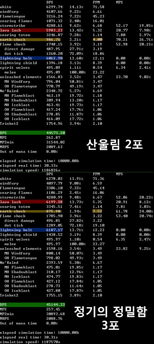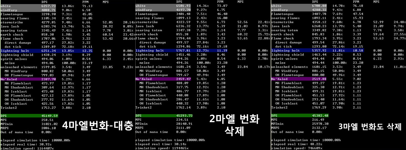 [4.3] PvE 고양술사 스킬우선순위 및 특성8개월만에 고양술사 스킬우선순위 글을 쓰게 됐네요! 먼저 이번 글을 쓰는데 가장 큰 역할을 한 시뮬레이션 두가지를 소개합니다.Simulationcraft (http://simulationcraft.org/) 유저들에게 가장 잘 알려진 시뮬레이션이죠...부정확하다는 말도 많지만 그래도 참고용으로 괜찮은 시뮬레이션입니다. EhnSim (http://enhsim.codeplex.com/) 고술 전용 시뮬레이션으로 스킬우선순위(딜사이클)를 자신이 직접 설정하여 시뮬레이션을 돌릴 수 있다는 점과 고술만의 상세한 설정들이 가능하다는 장점이 있습니다. ------------------------------------------------------------------------------------------------------------ 이번 스킬우선순위 글을 쓰는데 직접적인 실험(허수아비!)이 기반이 되었다면 더할나위없이 좋겠지만, 제가 플레이할 시간도 많이 부족하고 파밍도 부족하기 때문에...직접 실험보다 시뮬레이션에 많이 의지하게 되었습니다. 따라서, 제 글을 보고 직접 플레이에 적용했을때 달라질 수도 있다는 점을 참고해주셨으면 좋겠습니다. EhnSim에 오크의 BiS 캐릭터 스펙을 입력하고 레이드 버프 및 디버프(마집,의도 등의 특수 버프 제외), 영약, 물약 등의 최적의 dps를 뽑아낼 수 있는 조건으로 기본 설정, 이후 스킬우선순위들을 조금씩 바꿔가며 시뮬레이션을 돌려봤습니다. 모든 실험은 공통적으로 시뮬레이션시간-10000시간, 시뮬레이션 전투시간-7분30초로 설정하였습니다. 기타 설정값이나 EhnSim의 설정값이 궁금하신 분들은 제가 실험했던 설정값을 첨부해놓았으니 EhnSim 다운로드 이후 첨부해논 설정값을 열어보시고 직접 실험해보시면 됩니다. 그리고 제가 수정해가며 최적의 스킬우선순위를 찾기 위해서는 모든 실험의 기초가 되는 스킬우선순위가 필요하기에, ej forum과 SimulationCraft에서 공통으로 제시하고 있는 4.3 고술 스킬우선순위를 기반으로 시뮬레이션을 시작했습니다. 1. 왜 스킬의 1순위가 용채가 아니라 폭격이 되어야 하는가? ![]() (클릭하시면 커집니다) EhnSim에서 스킬우선순위에 1순위를 폭격으로 했을때와 1순위를 용채로 했을때의 결과값 비교입니다. dps면에서 비교했을때 폭격을 용채보다 먼저 치는 것이 dps가 약간 높은 것을 보여주는데요. 용채가 데미지 기댓값만 비교했을 때는 폭격보다 높지만 용채의 쿨은 10초로 폭격보다 2초 더 깁니다. 따라서 용채를 먼저 치고 이어서 폭격을 치는 경우에는 글로벌쿨타임 1.5초때문에 폭격의 쿨이 8초임에도 불구하고 용채와 같은 10초쿨로밖에 활용을 못하게 됩니다. 따라서 폭격을 먼저 치고 이어서 용채를 치면 각자의 쿨이 따로 돌아오게 되어 데미지 기댓값이 가장 높은 두 스킬을 겹치지 않게 쓸 수 있게 되어 약간의 dps향상을 보이게 되는 것입니다. 위의 시뮬레이션 결과에서 ppm은 1분당 쓸 수 있는 스킬 횟수를 나타내는데요. 폭격을 먼저 치게 되면 용채의 ppm이 0.1 떨어지는 대신 폭격의 ppm이 0.23 올라가는 것을 보여줍니다. 만약 전투시간이 10분가량 된다면 용채 1번 덜쓰는 대신 폭격 2.3번을 더 쓸 수 있게 되는것이죠. 2. 최적의 스킬우선순위를 찾기 위한 과정 ![]() (클릭하시면 커집니다) (왼쪽) 가장 먼저 스킬우선순위에 추가한 것은 대지충격보다 4마엘 번화의 우선순위를 높혀봤습니다. 4.2 불의땅에서 시뮬레이션을 돌려봤을때도 4마엘 번화를 대지충격보다 먼저 쓸때 약간의 dps향상이 있었으므로 이번에도 실험해보았는데 역시 미약하지만 약간의 dps향상이 있었습니다. (가운데) 다음은 ej forum과 SimulationCraft에서 제시하는 '모든 스킬이 쿨일때 2마엘 이상이면 번화를 써라' 를 수정해보기로 했습니다. 4.2 까지만 해도 캐스터 고술도 유행하고 평타보다는 마법의 비중을 높혀 2마엘 번화도 가치가 높았습니다. 하지만 4.3 전투력 패치 및 고술 BiS의 고민첩 저특화 세팅으로 인하여 평타와 질풍의 가치가 많이 높아졌습니다. 따라서 2마엘 번화를 캐스팅하는것은 손해가 되지 않을까 싶어, 모든 스킬이 쿨이더라도 2마엘이 아닌 3마엘부터만 번화를 시전하도록 수정해보았습니다. 역시 예상대로 100이상의 dps향상이 있었습니다. 본래 실험은 여기서 끝내고 최종적 결론을 내리려 했지만... 얼마전 있었던 paksw님의 허수아비 실험글과 번화 활용에 대한 말씀을 듣고 추가적 실험을 하게 되었습니다. (오른쪽) 평타와 질풍의 가치가 커졌다면 3마엘 번화가 캐스팅 시간이 짧지만 이것 역시 손해 아닐까 싶어 모든 스킬이 쿨이더라도 3마엘 번화를 안쓰고 평타를 때리도록 설정했습니다. 결과는 3마엘 번화를 쓸 때보다 안쓸 때의 dps가 약간 더 높은 것으로 나왔습니다. 여태껏 당연하게도 3마엘 번화를 자주 활용해왔던 저는 머리를 얻어맞은 듯한 느낌을 받았습니다... 3. 템렙이 낮은 캐릭터의 경우 ![]() (클릭하시면 커집니다) 이번에는 BiS 캐릭터와 비교하기 위해 템렙 390일때의 제 캐릭터의 설정으로 바꾸어 실험을 해보았습니다. 당시 실험 스펙은 일반 4셋+행렬+액질+무작노칼 쌍수+특화 2275의 스펙이었습니다. (왼쪽) 모든 스킬이 쿨일때 2마엘 이상이면 번화를 캐스팅하는 것 (가운데) 모든 스킬이 쿨일때 3마엘 이상일때만 번화를 캐스팅하는 것 (오른쪽) 모든 스
