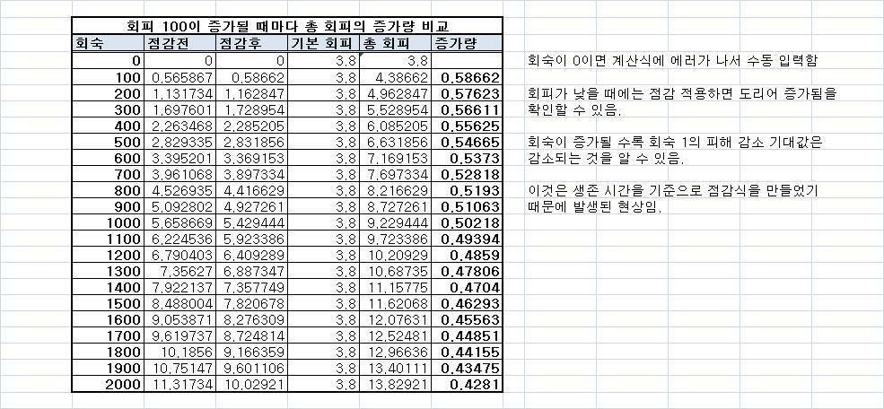정말 많은 양을 계산해 주셨더군요. 그런데 한가지.. 아쉽게도!!! 완방의 점감이 적용되지 않고 단순히 현재 회피 수치에 회숙으로 나누셨더군요. 그런데 문제는 점감이라는게 있어서 단순히 회숙이 증가된다고 그 비율만큼 증가되는건 아니란 겁니다. 제 글과 다른 결론을 내셨기에 왜 그런가 분석을 해보니 와해쌈장군님은 완방에 점감을 적용하지 않아서 그런 것이라고 생각합니다. 예전의 제 글(링크)에서 저는 '회피 9.15%를 넘는 경우에는 회숙보다 특화력이 좋습니다. 무막 10.18%를 넘는 경우에는 무막숙보다 특화력이 좋습니다.'라는 결론을 내렸죠. 점감에 대한 설명은 글보다는 일단 아래에 제가 작성한 엑셀 시트를 봐주세요. :) ![]() ![]() 이것은 제가 첨부한 엑셀 파일을 캡춰해서 올린 것입니다. 엑셀 돌리기 싫으신 분들은 이걸 보세요. :) 완방은 특성으로 올리는게 아니라면 모두 점감을 받게 되어있습니다. 민첩으로 올리든 힘으로 올리든 모두 다 말이죠. 그리고 점감이란?! 옷 다 벋고(므흣) 회숙이 0일때에 회숙 100을 올리면 회피는 점감후 0.58%가 증가되지만 회숙 1400인 상태에서 15000으로 증가되면 회피는 점감후 11.15775%에서 11.62068%로 0.46293%만 증가한다는 것입니다. 쉽게 말해서 그러니 점점 갈수록 효율이 떨어지게끔 되어있는 노릇이니 결국 회숙 1의 효율은 점점 떨어지는 것처럼 보인다는 것입니다. 아래의 그래프는 제가 matlab으로 그린 그래프입니다. ![]() 이처럼 회숙이 4000이 되면 점감 때문에 거의 5% 이상 차이가 난다는 것이죠. 와해쌈장군님의 시트는 점감 적용이 안되었으니 그만큼 실제와는 다르게 계산되는거 같습니다. -뱀발 1- 완방 관련 시트를 짜시려는 분들을 위해 완방 점감 공식을 설명해놓은 엑셀 시트를 첨부합니다. -뱀발 2- 본 게시물은 아래의 사이트를 참고했습니다. http://elitistjerks.com/f15/t29453-combat_ratings_level_85_cataclysm/