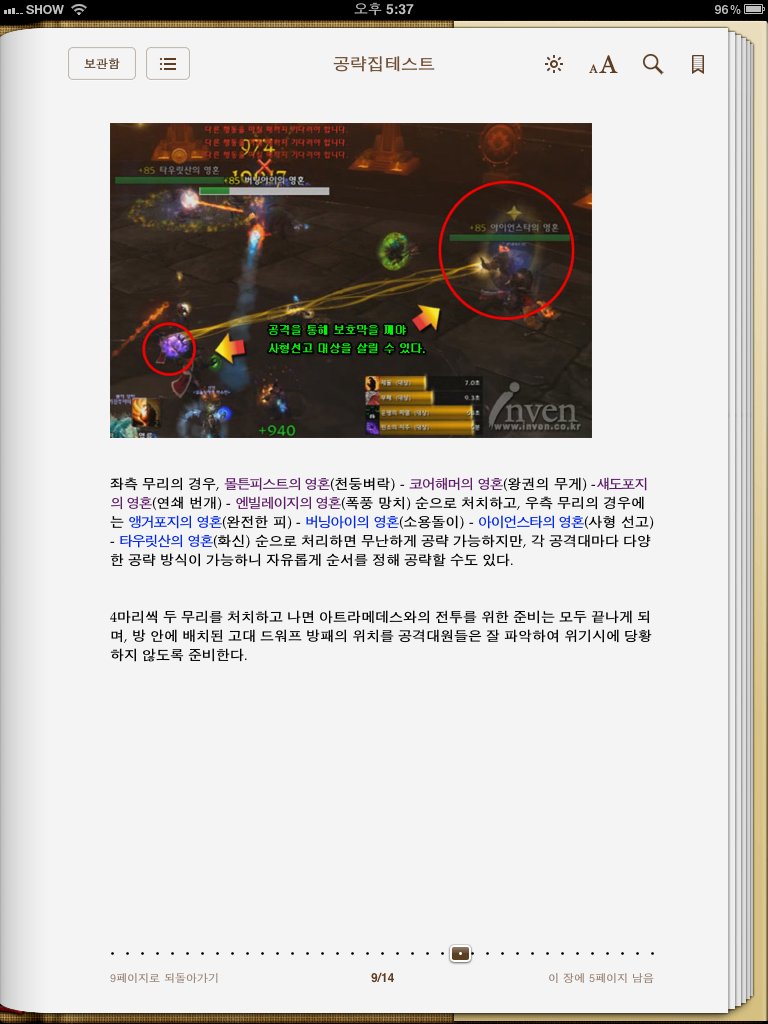 또또또.. 공략집 만들기... ㅋ이전에 5인던전 공략집으로... 제가 만들었지만 저는 효과를 좀 봤는데요... 어떠셨는지요... [5인던전 공략집 e-book 바로가기] 이번에는 인벤에 레이드공략이 슬슬 올라오기시작하여.. 레이드공략집 제작에 착수했습니다. 지난번엔 매우매우 심플하게만 만들어서 내용간에 구분이 힘든면도있었는데.. 이번엔 방법을 좀 다르게 하여... 와우인벤의 인터넷페이지 느낌을 최대한 살려서 만들예정입니다. 제목에 기호(그림)도 넣어지고.. 중요한 내용은 웹페이지그대로 컬러풀한 글씨가 됩니다. 근데 이런걸 왜 성게에 올리냐구요!!? 전 성기사고 성게가 단지 좋아서...( __)a 아참 오늘 순백님이..트위텇에서 저보고.. "우리는 맥북에어 칭구칭구!" 이러시는데... 참 간만에 반갑네요~ ㅎㅎㅎ [레이드공략집 샘플 미리보기] ![]() ![]()