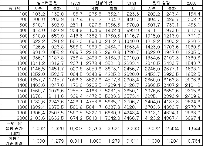 역시 4.2패치의 영향이 큽니다. 특화의 수치가 조정되면서 효율이 증가했고 극대의 효율도 2배가까이 증가했네요. 하지만 맨 처음 세팅과 달리 10%이상 차이 나던 지능과 특화의 힐량 증가 비율이 10%미만이 됩니다. 그렇다면 장비에 의한 차이가 있는 걸까요? 5)용영 일반 졸업급의 스탯당 힐량 증가 표 용영 초입 수준의 장비를 용영 일반 졸업급으로 끌어올려봅시다. (무기주문력 3010, 지능 7000, 특화 800,극대 800 정도)