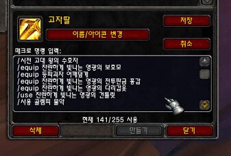 *애드온- Extra CD (아이템의 내부쿨과 발동지속 시간을 볼수 있게 해주는 에드온) *매크로1 /시전 고자왕 /사용 골렘피 물약 /착용 T13 머리(쉬프트 아템 클릭 하면 일일이 안써도 됩니다.) /착용 T13 어깨(쉬프트 아템 클릭 하면 일일이 안써도 됩니다.) /착용 T13 가슴(쉬프트 아템 클릭 하면 일일이 안써도 됩니다.) /착용 T13 바지(쉬프트 아템 클릭 하면 일일이 안써도 됩니다.) *T11 보호기사 4셋의 효과를 보면 고자왕 사용시 지속시간 50%증가 30초>45초가 됩니다. 고자왕을 뽑고 원래 장비로 바꿔 입어도 그효과는 유지됨
