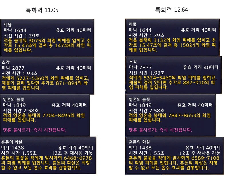 암흑불길과 점화를 빼먹었는데 특화가 적용되는 것은 확인했습니다. 그리고 각 스킬마다 툴팁에 나온 데미지가 정상적으로 들어가는 것도 확인했구요. 그럼 하나씩 비교해서 얼마만큼의 증가가 있는지 계산해봐야겠져.