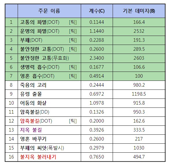 의도한건지, 실수인지는 모르겠는데 일관성이 없는건 좀 맘에 안 든다는..이는 고흑의 특화력의 기댓값이 낮은 요인 중 하나로 보입니다. 아무튼 부패만 예외고, 위의 특화력이 적용되는 주문은 {1+(자신의 특화력 * 1.63%)}를 곱하면 됩니다. 그리고 위의 영혼 흡수의 경우, 특성에 있는 영혼 착취,죽음의 은총이 반영이 안된 평상시의 계수로, 마격탐의 영흡의 계수는 고흑의 주문 중 가장 높을 것으로 예상됩니다. 악마