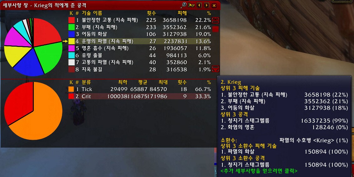 고흑의 운파 vs 고파레이드에서 고흑 단일딜일 때, 문양 박은 고통의 파멸(이하 고파)이 운명의 파멸(이하 운파)보다 더 좋다는 의견이 많이 보여서 둘의 비교를 한번 해보겠습니다. 우선 고파가 운파보다 좋다는 사람들의 주된 의견을 요약해보면, 1. 고흑은 가속세팅이 우선이다. → 맞음 2. 운파는 가속의 영향을 받지 않아 틱수(4틱)가 고정이다. → 맞음 3. 고파는 가속의 영향을 받아 틱수가 증가한다. → 맞음 결론: 그러므로 고파가 더 좋다 → 과연..? 저 결론이 맞는지 틀렸는지 비교해봅시다. 우선 운파와 고파 각각의 주문력계수와 기본 데미지입니다. ![]() 고파의 경우, 위의 경우 <중간>틱의 주문력계수와 기본데미지이고, 시간에 따라 데미지가 점차 증가합니다. 아래 특징 부분에서 자세하게 설명합니다. 이게 대체 뭐야? 라고 하실 분이 있을거 같아 잠깐 설명하겠습니다. 데미지 = 기본 데미지 + ( 계수 * 주문력 ) 여기에 추가로 특성,문양,버프,디버프 등을 통해 데미지는 점점 커집니다. 이 부분은 운파와 고파 둘 다 똑같이 적용되므로 제외합니다. 고파 : 28초(1회 시전시 지속시간) * 15(시전횟수) = 420 운파 : 60초( “ ) * 7 ( ” ) = 420 주문력은 9천으로 가정, 420초 기준으로 둘을 비교를 해보겠습니다. 운파 = { 1947.7 + (0.88 * 9000) } * 4(틱) * 7(시전횟수) = 276295.6 고파가 운파보다 좋으려면, 고파 = { 128 + (0.088 * 9000) } * N(틱) * 15(시전횟수) > 276295.6 N > 20.0214 오차로 인해 20틱에서 고파가 좋을 수도 있지만, 확실하게 우위가 아닌 이상 고파를 쓸 이유가 없으므로 고파 1회 시전시 21틱 이상이 들어가야 운파보다 좋다고 할 수 있습니다. (이 부분이 틀리다면, 태클 환영합니다) 그럼 가속에 따른 틱수가 어떻게 되는지 봐야겠죠. 흑마법서 님의 글(링크)에서 몰래 훔쳐온 표입니다. 보시면 현재 가능한 세팅은 고파 19틱이 되는 가속 2842 세팅이 될 거 같네요. ![]() 그럼 각각의 상황에 따라 고파가 몇틱이 들어가는지 알아봐야겠죠. 제 캐릭으로 가속 2885를 맞추고 가속시너지5% + 의도3%를 적용했을 때, 가속은 약 32.52%가 됐고 고파의 틱수는 아래와 같습니다. 평상시 : 19틱 운파 > 고파 + 박멸 : 22틱 “ < ” (약간 우위) + 블러드 : 24틱 “ < ” + 박멸 + 블러드 : 29틱 “ < ” (매우 우위) 박멸이 있을 때는 운파보다 약간 우위를 보이고, 블러드 시에는 고파가 상당한 우위를 보이네요. 이제는 둘의 특징과 활용 측면을 살펴봅시다. 특징 <고파> 1. 가속에 따라 틱 수가 증가. 도트 데미지가 일정하게 들어가지 않고, 시간이 지날수록 [ 낮음 -> 중간 -> 높음 ->매우높음 ] 순으로 점차 증가. 각각의 데미지는 아래처럼 추정됩니다. <낮음> = <중간> - (기본데미지/2) <높음> = < “ > + (기본데미지/2) <매우 높음> = < “ > + 기본데미지 <매우 높음>데미지로 인해, 고파는 툴팁에 나오는 데미지보다 약간 더 많은 데미지를 주지 않을까 생각됩니다. (고파의 메커니즘은 상당히 복잡한 것으로 보이고, 정확하게 아시는 분은 알려주세요) 2. 대상에 고파가 이미 박힌 상태에서 리필을 하게 되면, 틱수 = 가속에 따른 틱수 + 1틱. (여기서 +1틱의 데미지는 후반의 <매우 높음>이 아닌 초반의 <낮음>데미지) 딜 로스 = 시전시간 1초 + 이전 고파의 초반의 낮은 데미지로 인한 딜로스가 발생. <운파> 1. 1회 시전시 4틱고정. 가속의 영향을 받지않음. 일정한 도트 데미지가 15초마다 들어감. 오로지 한 대상에게만 유지가 가능. 2. 대상에 운파가 이미 박힌 상태에서 리필을 하게 되면, 틱수 = 4틱 + 1틱. 딜 로스 = 시전시간 1초. 활용 <고파> 1. 전투 내내 오로지 고파만 사용할 경우, 고파를 사용할 때 항상 박멸이 떠 있다면 운파보다 좋은 결과를 가져올 수 있겠지만, WMO에서 몇몇 고흑의 로그를 확인해보니 박멸의 유지시간은 전투시간에서 보통 2~30%정도에 그치고 있고, 아주 높은 경우가 40%초중반대를 보였습니다. 그러므로 고파 리필시에 박멸이 있을 확률보다 없을 확률이 더 높습니다. 2. 게다가 장신구 같은 버프 시 리필에 있어서도, 리필 시 항상 버프가 떠 있을 수가 없고 대상에 이미 고파가 걸려있을 때의 리필은, 이득과 함께 이전 고파의 초반의 낮은 데미지로 인한 손실도 안고 가야된다는 점이 있다는 것. 혹시나 해서 하는 말인데 “저는 고파 리필할 때, 박멸 항상 떠 있고 장신구도 항상 발동돼 있던데요” 이런 소린 사양합니다... 3. 다만, 블러드 시에 고파의 틱수를 보면 24틱, 블러드+박멸 시에는 29틱으로 운파보다 각각 대략 25%, 50% 증가한 데미지를 기대할 수 있습니다. 상당히 강력하죠. 블러드가 올라갔다면 고파를 씁시다. <운파> 1. 운파의 경우, 기껏 세팅한 가속의 효과는 못 받지만 데미지 자체도 우수하고, 특히 대상에 이미 운파가 걸려있을 때 리필시 +1틱의 활용 부분에서 고파에 비해 월등한 모습을 보입니다. 왜냐하면 글 맨 위의 주문력계수와 기본데미지를 보면 아시겠지만 운파의 1틱은 대략 고파의 10틱에 해당하는 데미지를 주기 때문입니다. 발동 효과를 고려해서 이 부분을 잘 활용한다면 상당한 dps상승을 노릴 수 있습니다. 2. 예를 들어, 전투를 시작하고 극초반에 반드시, 모든 발동 효과가 동시에 터져 있을 때(전투 시작후 약 10초 전후)가 있는데
